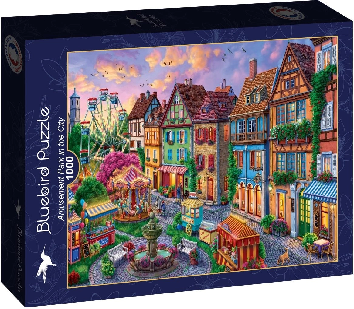 Entdecken Sie die bunte Atmosphäre eines städtischen Luna-Parks und setzen Sie ein eindrucksvolles Bild mit den Maßen ca. 69 × 47,8 cm zusammen. Das 1000-Teile-Puzzle der Marke BLUEBIRD bietet eine ausgewogene Herausforderung, hervorragende Druckqualität und passgenaue Teile für flüssiges Puzzeln.