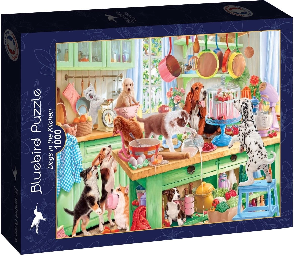 Viel Spaß mit dem Familienspaß Puzzeln und erschaffen Sie ein wunderschönes Bild mit Tiermotiv. BLUEBIRD Puzzle Hunde in der Küche mit 1000 Teilen bietet hochwertige Verarbeitung, lebendige Farben und ein Format von 69 × 47,8 cm nach dem Zusammensetzen – ideal zum Einrahmen oder für wiederholtes Puzzeln.