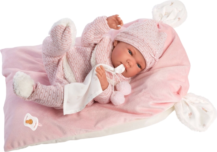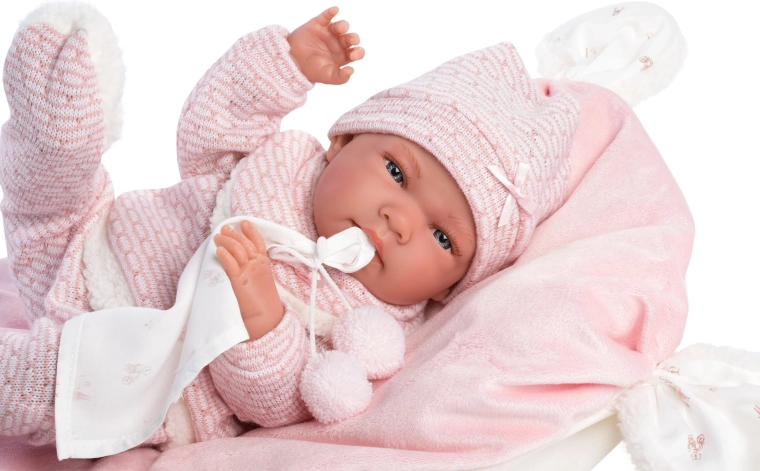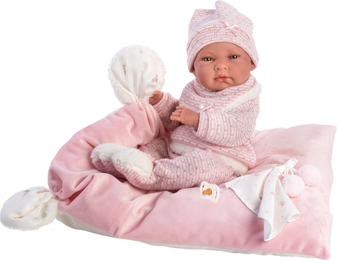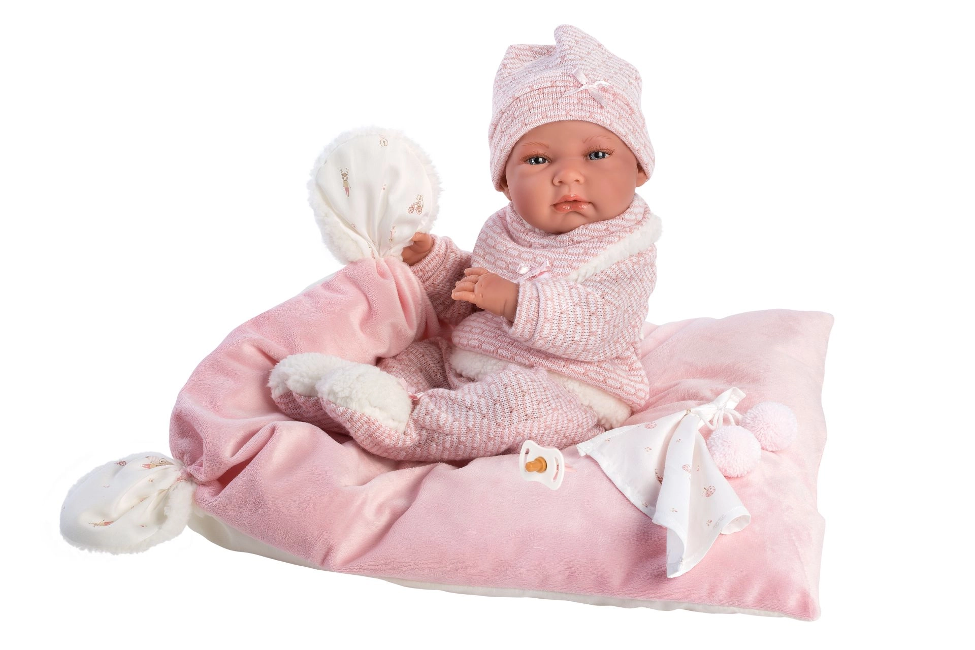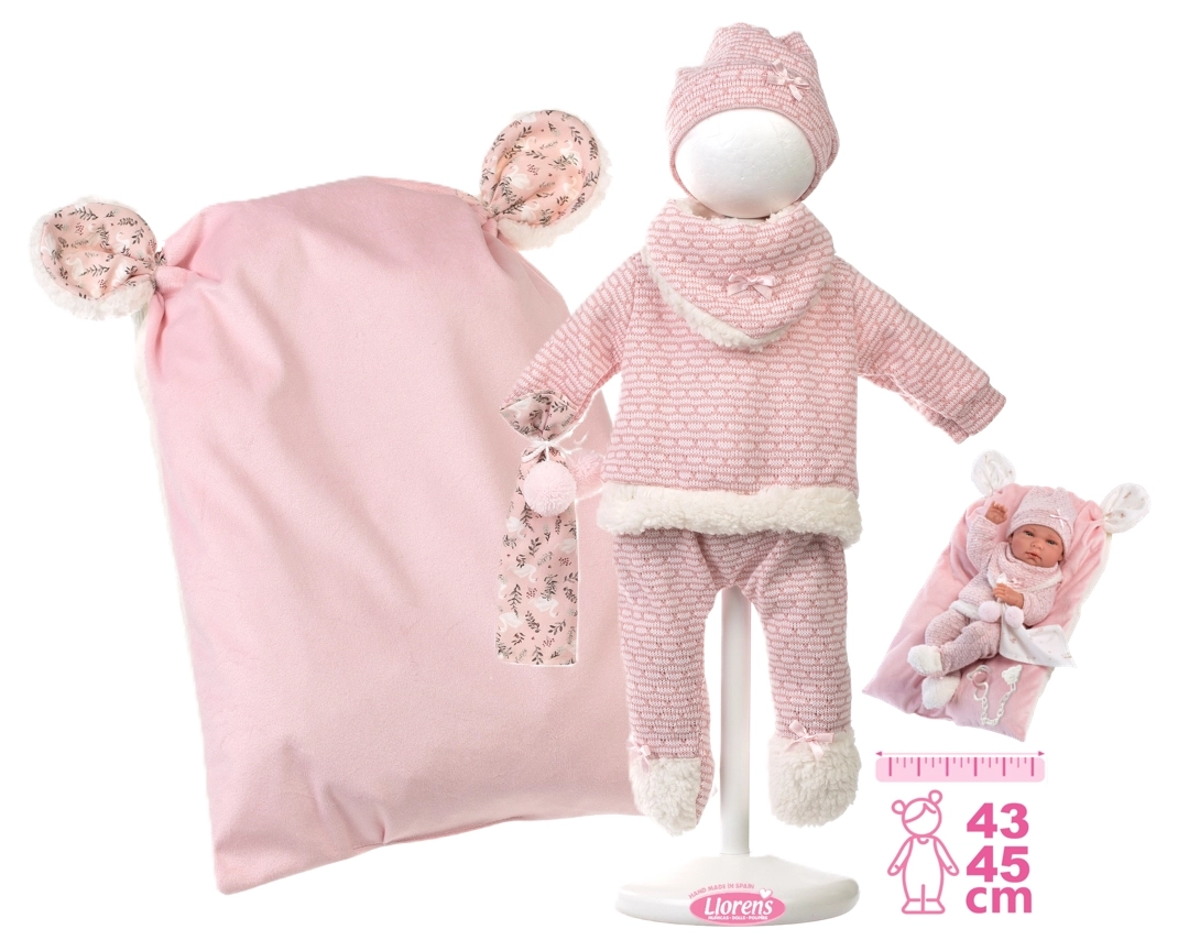 Ein stilvolles und wärmendes Outfit-Set für Puppen bietet alles, was kleine Pflegerinnen und Pfleger brauchen: weiche Strickteile mit zartem Fellrand, ein niedliches Kuscheltuch mit Bommeln und ein dekoratives Kissen, das auch als bequeme Unterlage dient. Alles ist für Llorens NEW BORN Puppen in der Größe 40–42 cm konzipiert.