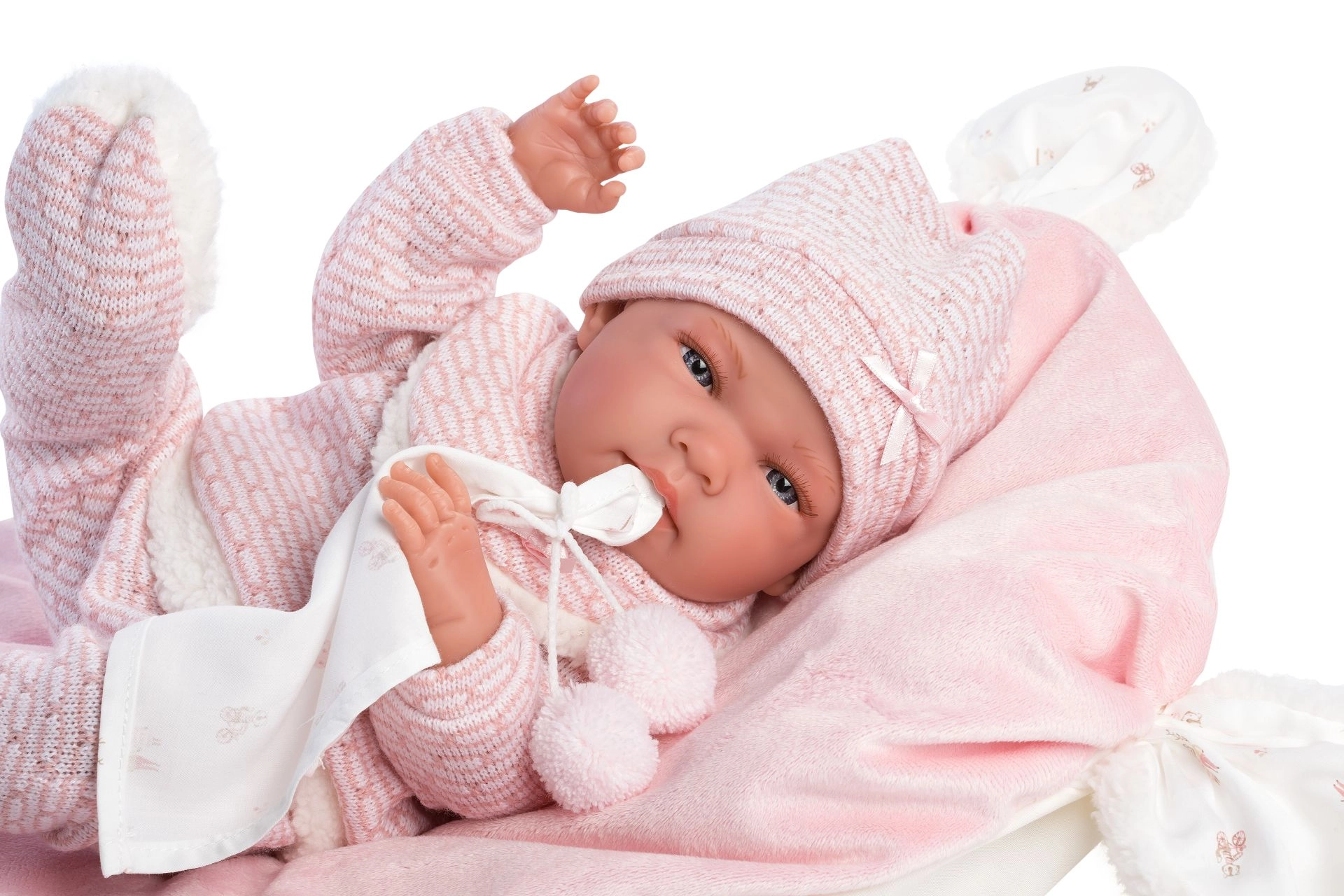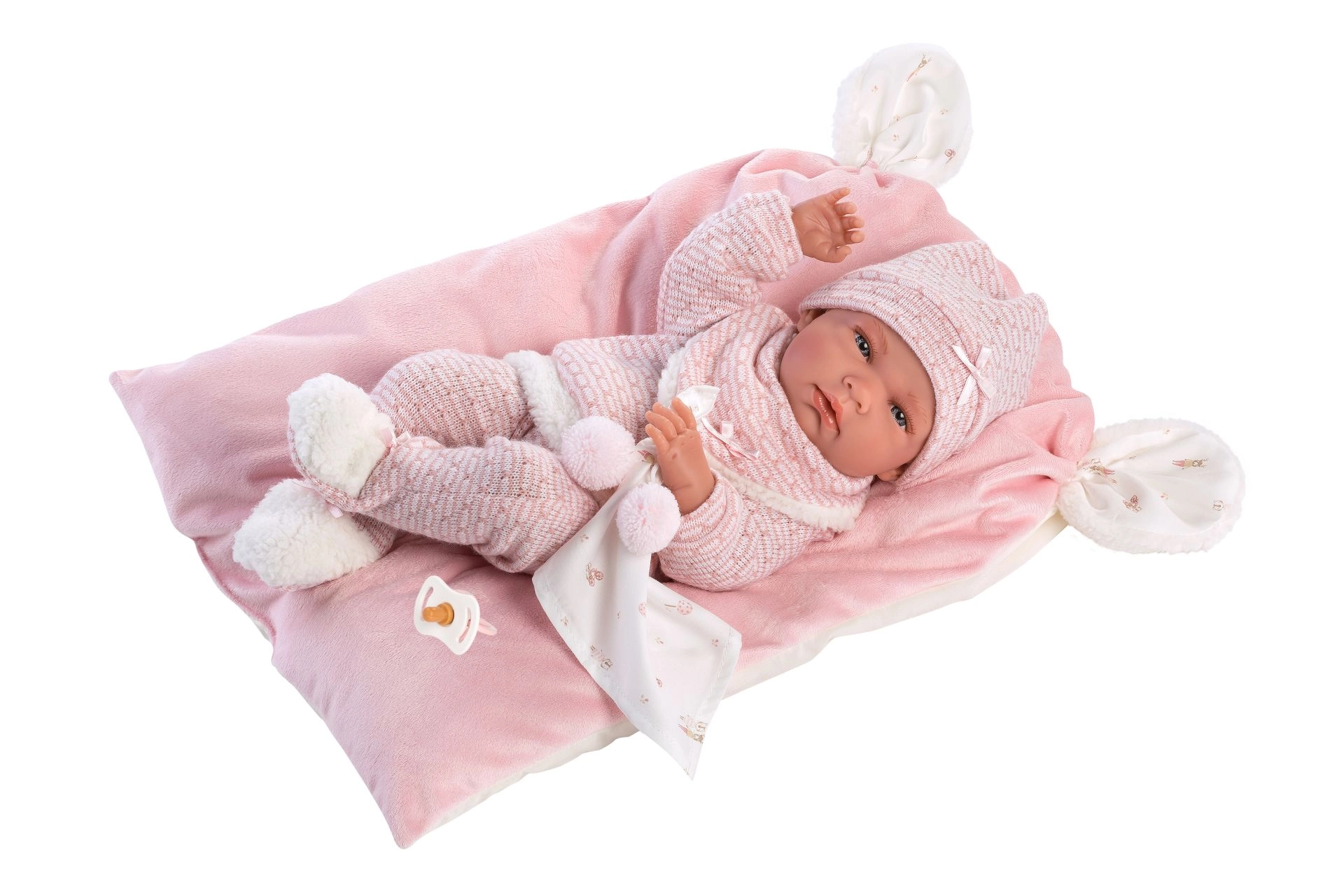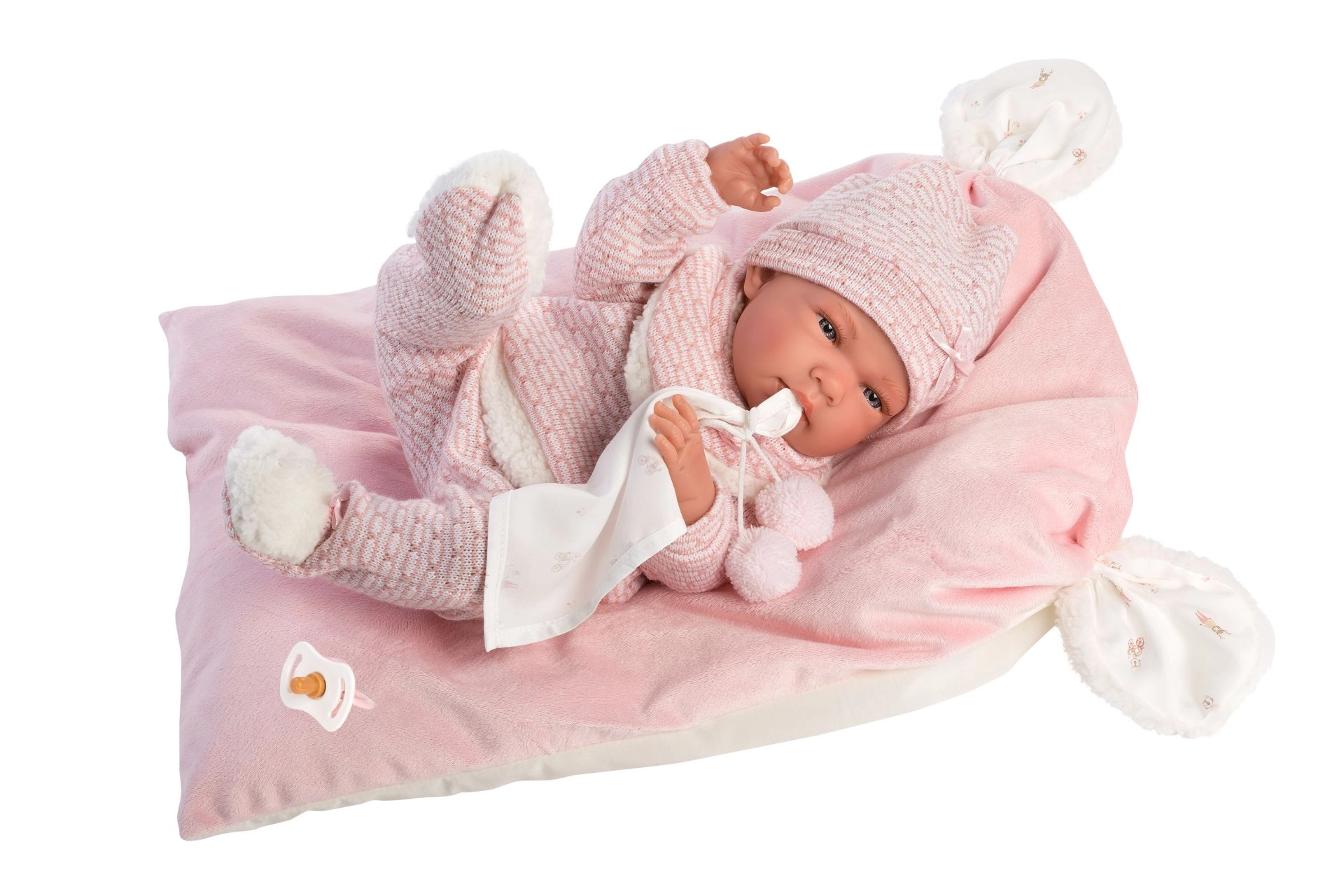 Ein stilvolles und wärmendes Outfit-Set für Puppen bietet alles, was kleine Pflegerinnen und Pfleger brauchen: weiche Strickteile mit zartem Fellrand, ein niedliches Kuscheltuch mit Bommeln und ein dekoratives Kissen, das auch als bequeme Unterlage dient. Alles ist für Llorens NEW BORN Puppen in der Größe 40–42 cm konzipiert.
