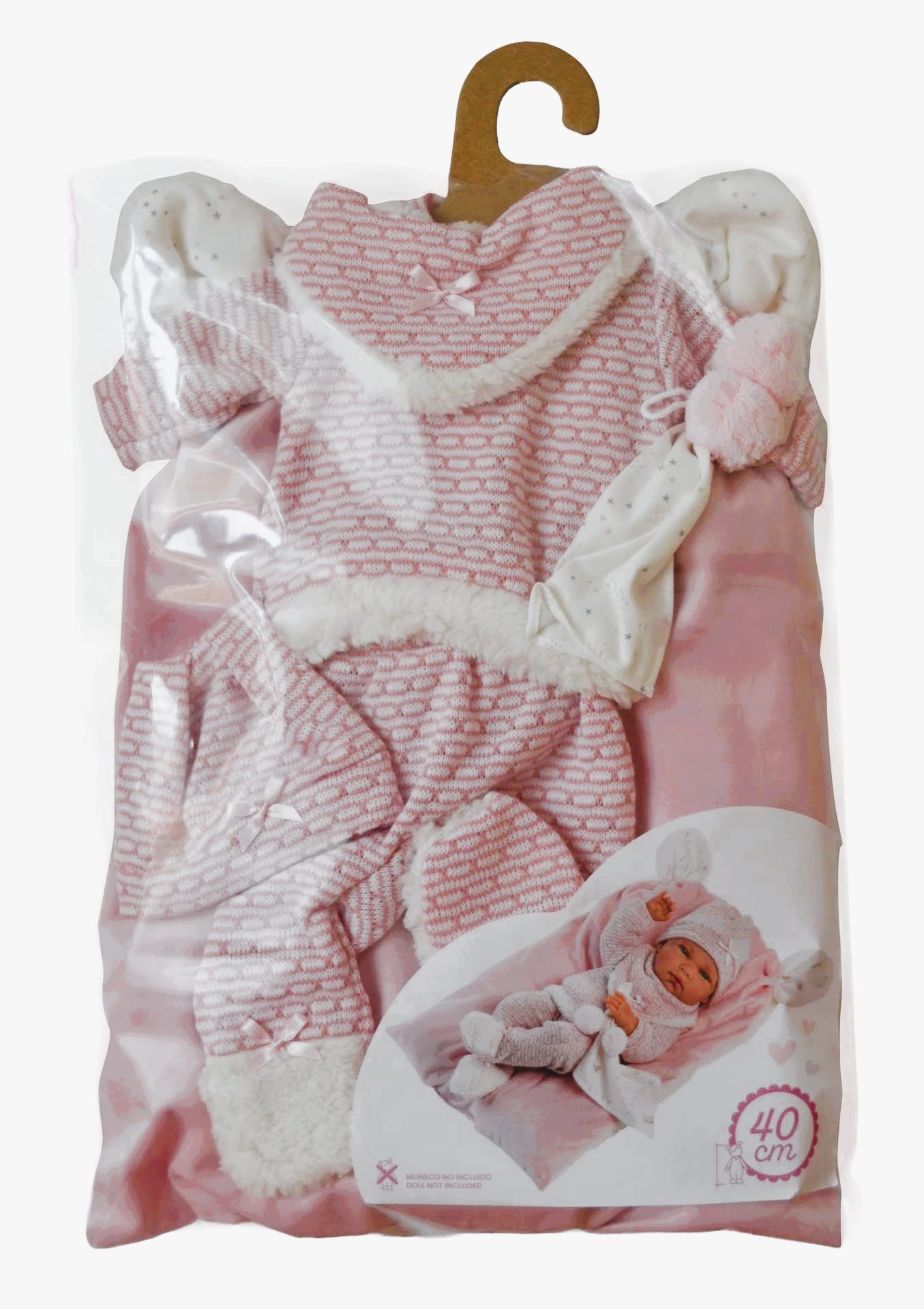 Das Set ist in einer transparenten Verpackung mit Kleiderbügel verpackt – übersichtliche Aufbewahrung, schnelles Umziehen und eine schöne Geschenkpräsentation.