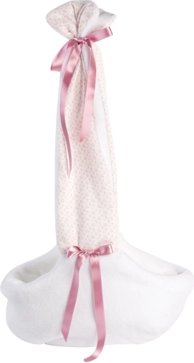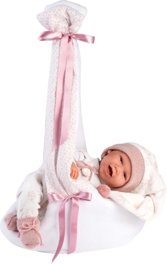 Die gepolsterte Stoff-Tragetasche mit Bändern und Kapuze hält die Puppe stabil und bequem, sodass Kinder überall freihändig spielen und sich um ihr „Baby“ kümmern können.