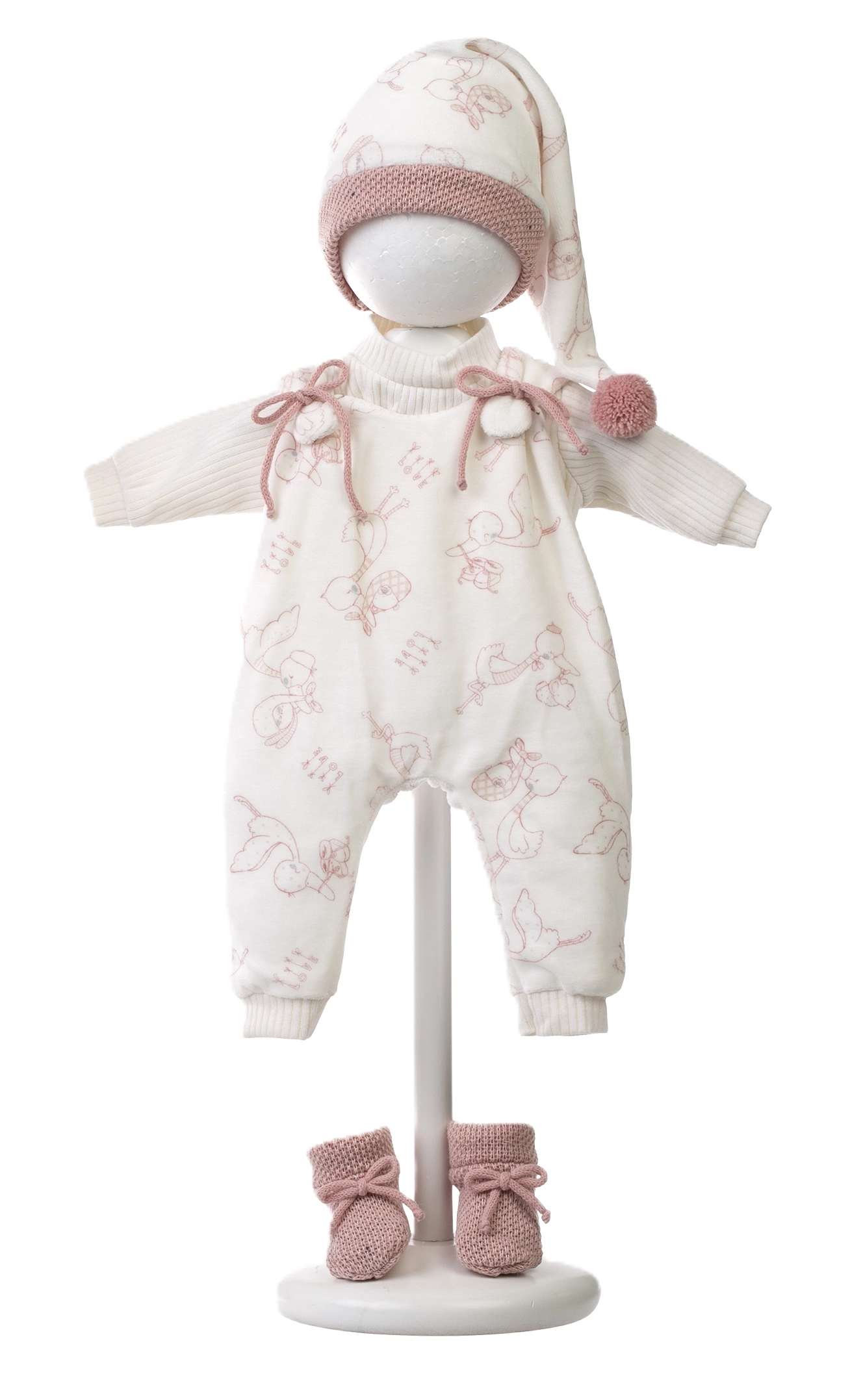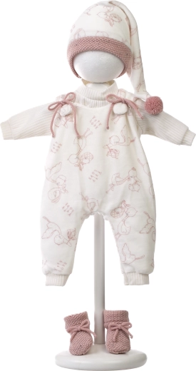 Das Set umfasst einen Body/Overall mit niedlichem Muster, eine lange Mütze und gestrickte Schühchen in zarten Farben – alles aus angenehmen Stoffen für leichtes Anziehen und den Komfort der Puppe.