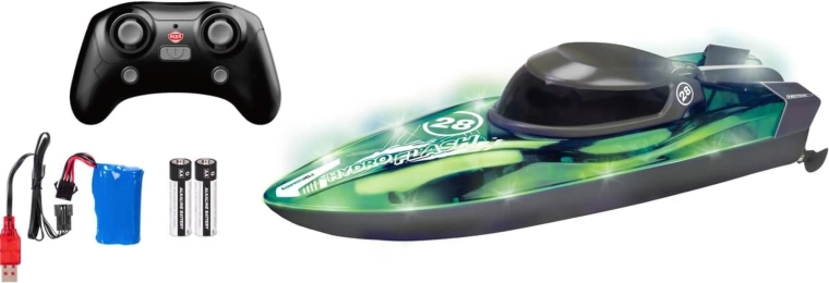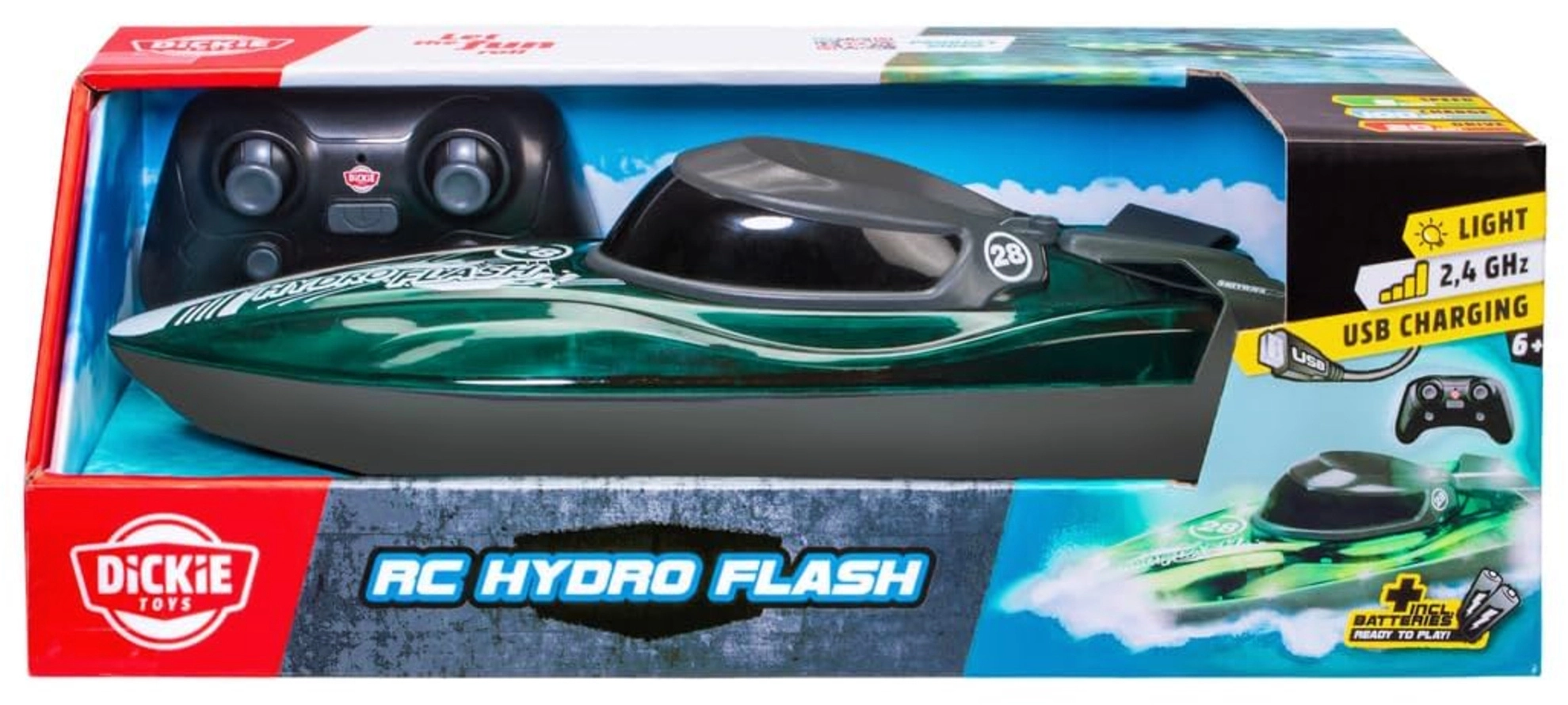 Entdecken Sie dynamischen Wasserspaß mit dem RC-Boot DICKIE TOYS Hydro Flash. Dank der 2,4‑GHz-Technologie ist die Steuerung stabil und störungsfrei, sodass Sie gleichzeitig mit mehreren Modellen fahren können. Der Turbo-Modus erhöht die Geschwindigkeit auf bis zu 8 km/h und sorgt für noch mehr Adrenalin und Spaß.