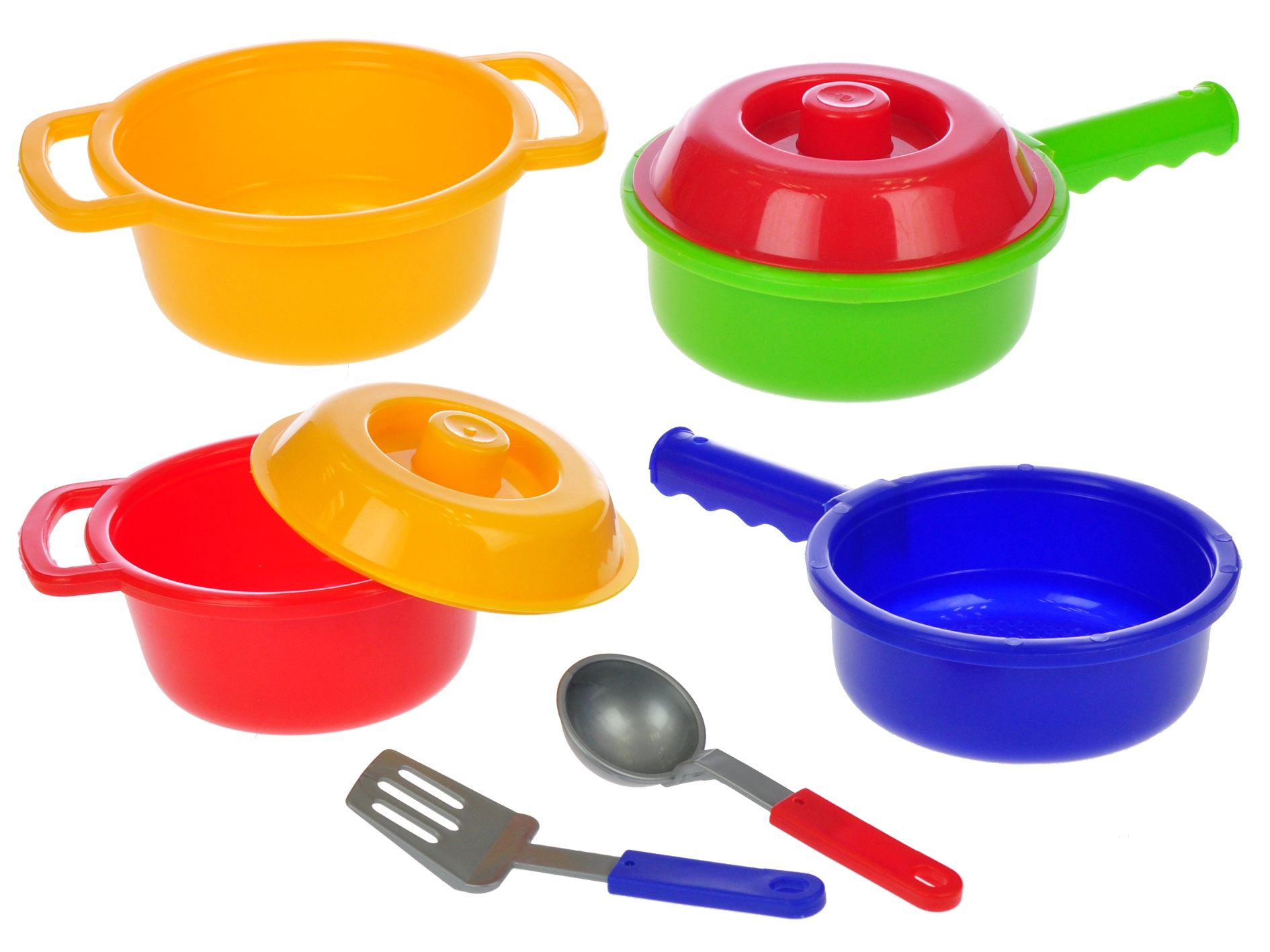Das Set umfasst Töpfe mit Deckeln, Pfannen und Utensilien (Schöpflöffel, Pfannenwender), damit Kinder das Kochen wie die Großen nachahmen können.