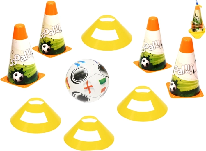 Im Set finden Sie 4 Hütchen (18 cm), Markierungsscheiben und einen Ball (12 cm) – alles für spielerische Übungen in Dribbling, Slalom und Präzision.