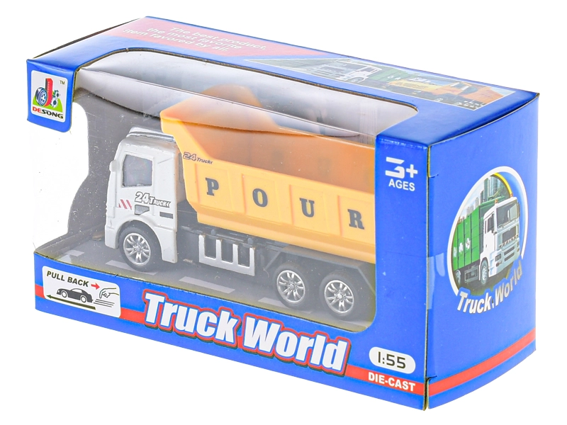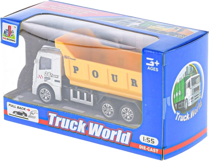Modell eines Kipplasters im Maßstab 1:55 mit funktionsfähiger Mulde und selbstständiger Fahrt nach dem Aufziehen für noch mehr Spielspaß.