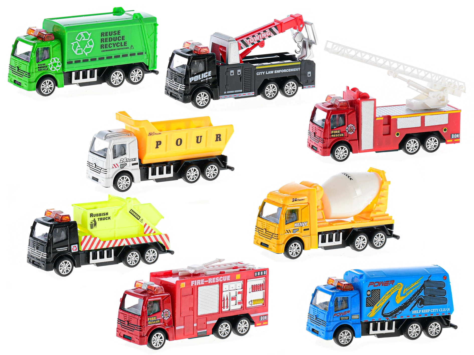 Auswahl aus 8 Arten: Müllabfuhr, Abschleppwagen, Feuerwehr, Kipper, Betonmischer und Straßenreiniger – ideal zum Aufbau der eigenen Stadt.