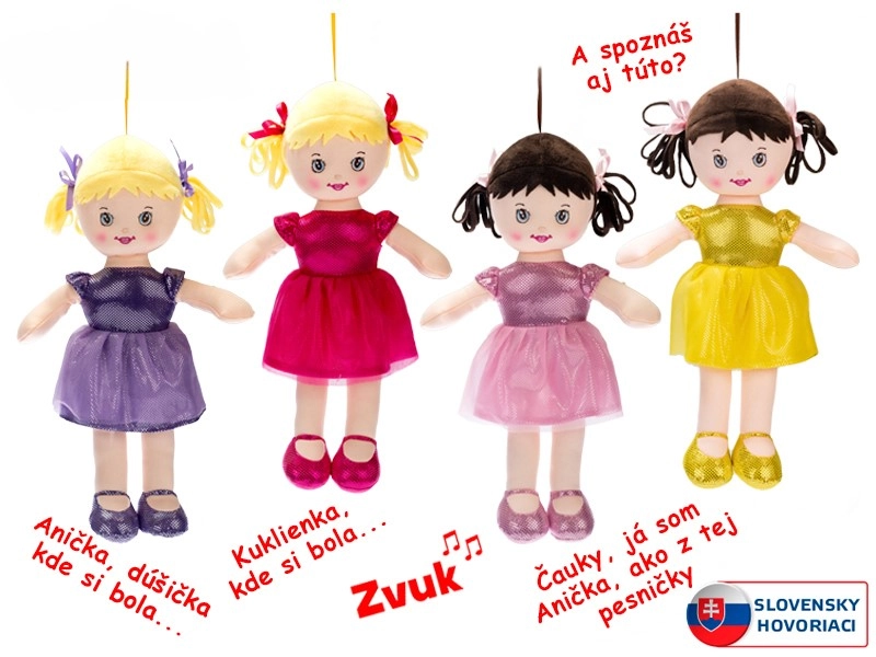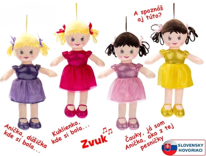 Die Puppe Anička ist eine weiche und leichte Stoffpuppe, die Kindern viel Freude bereitet. Durch die gesprochenen und gesungenen slowakischen Phrasen unterstützt sie spielerisch die Sprachentwicklung und Kommunikation. Das bunte Kleidchen und die Schühchen fallen sofort ins Auge und regen kreatives Rollenspiel an.