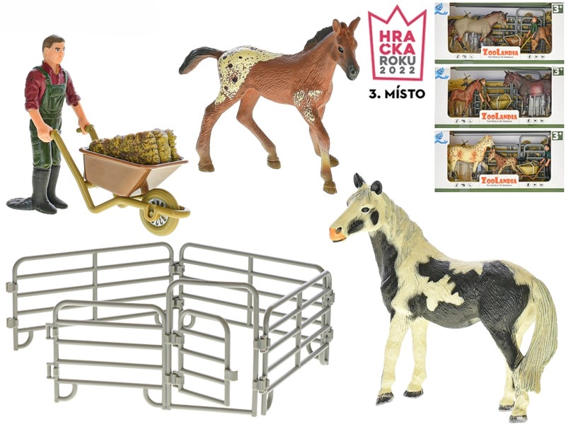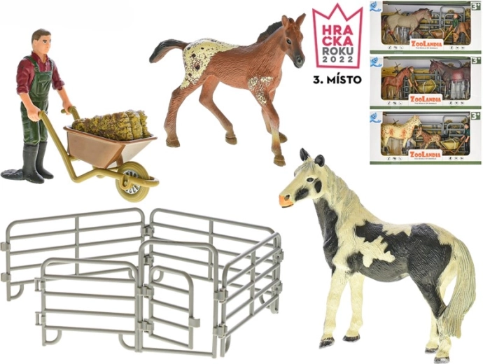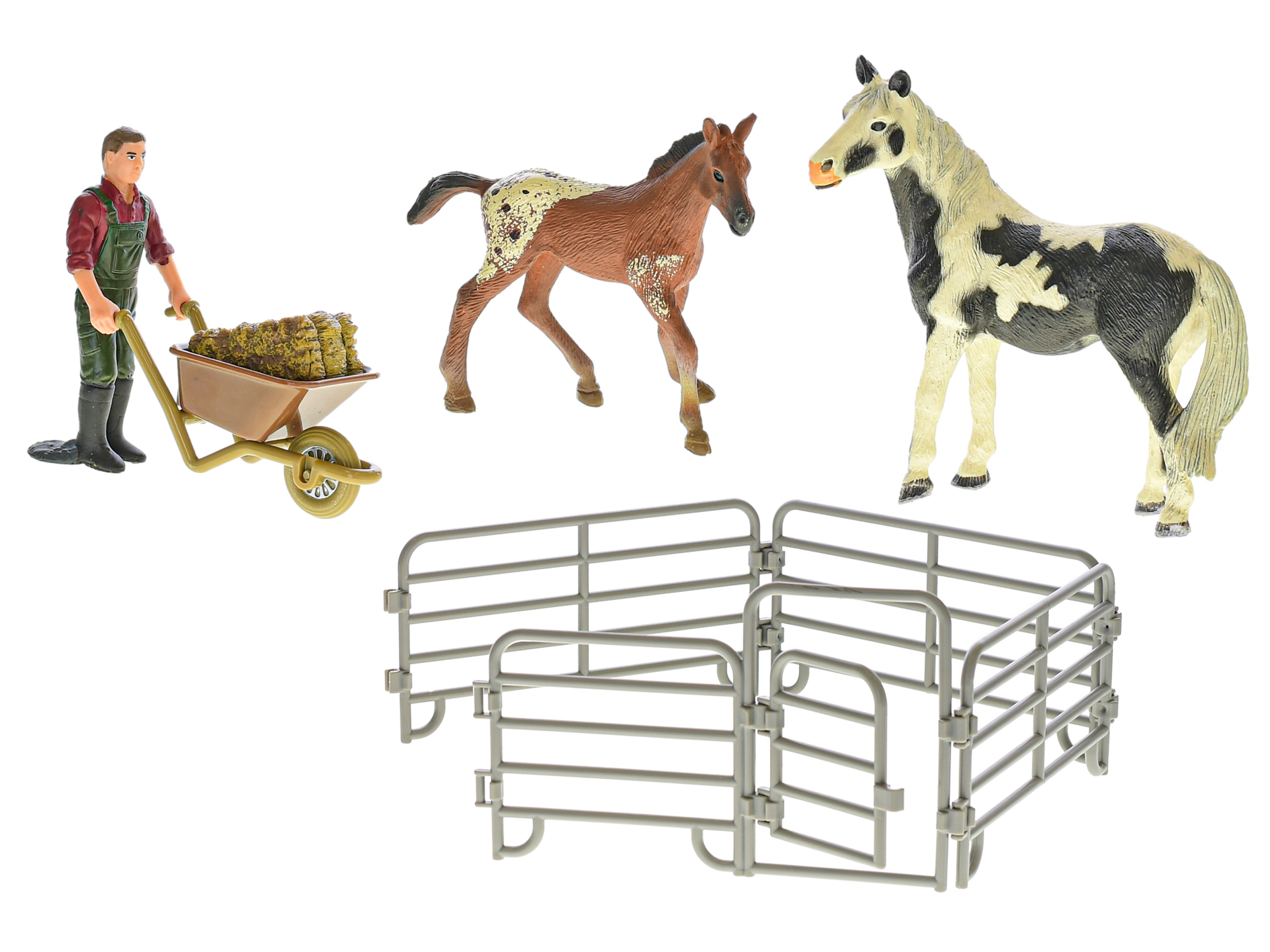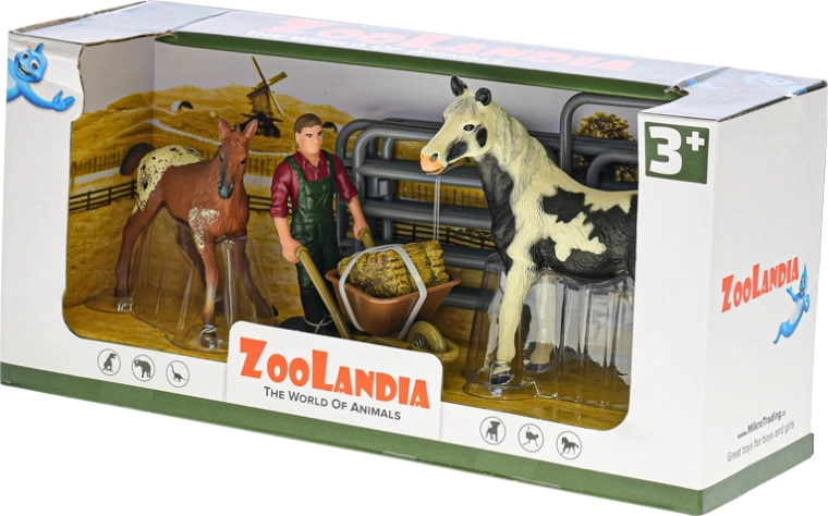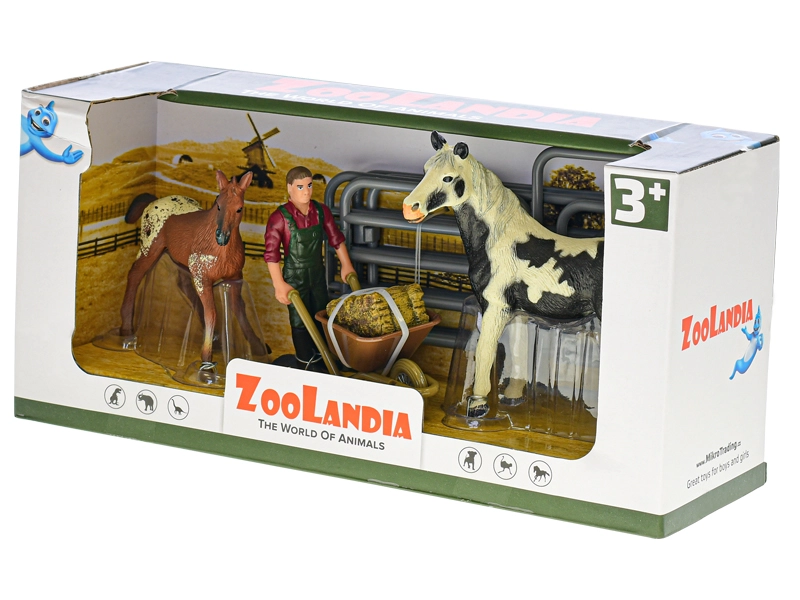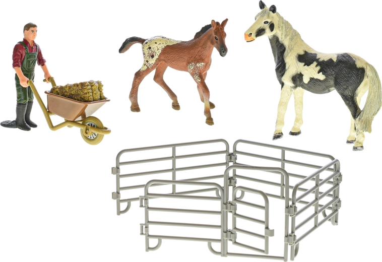 Wecken Sie die Fantasie der Kinder mit dem ZOOLANDIA-Bauernhofset. Realistisch geformte Figuren von Pferd und Fohlen, eine frei stehende Bauernfigur und ein modularer Pferch mit öffnendem Tor bilden die ideale Grundlage für Bauernhofgeschichten. Kinder können füttern, Heu transportieren und die Tiere sicher in den Auslauf bringen.