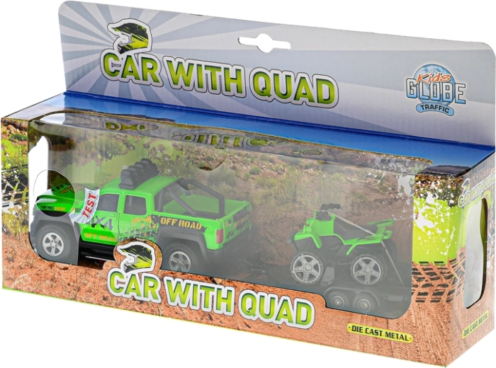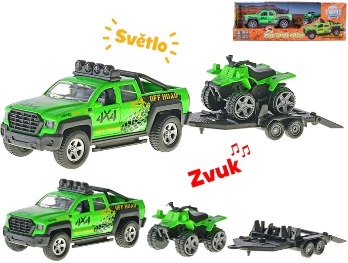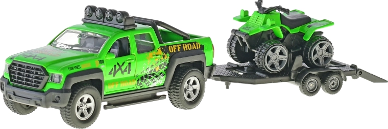 Detailgetreuer 4x4-Pick-up mit Anhänger und Quad für ein authentisches Spielerlebnis – robuste Räder, Dachleuchten und Auffahrrampe unterstützen kreative Spielideen.