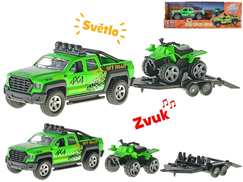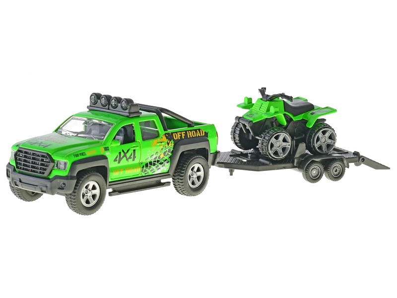 Dieses detailreich gestaltete Modell eines Offroad-Fahrzeugs mit Anhänger und Quad bietet Kindern ein authentisches Fahrerlebnis. Die Metallkarosserie gewährleistet Langlebigkeit und Stabilität, während der Rückzugsmotor eine natürliche und spielerische Bewegung ermöglicht. Licht- und Soundeffekte verleihen dem Spiel echte Atmosphäre.