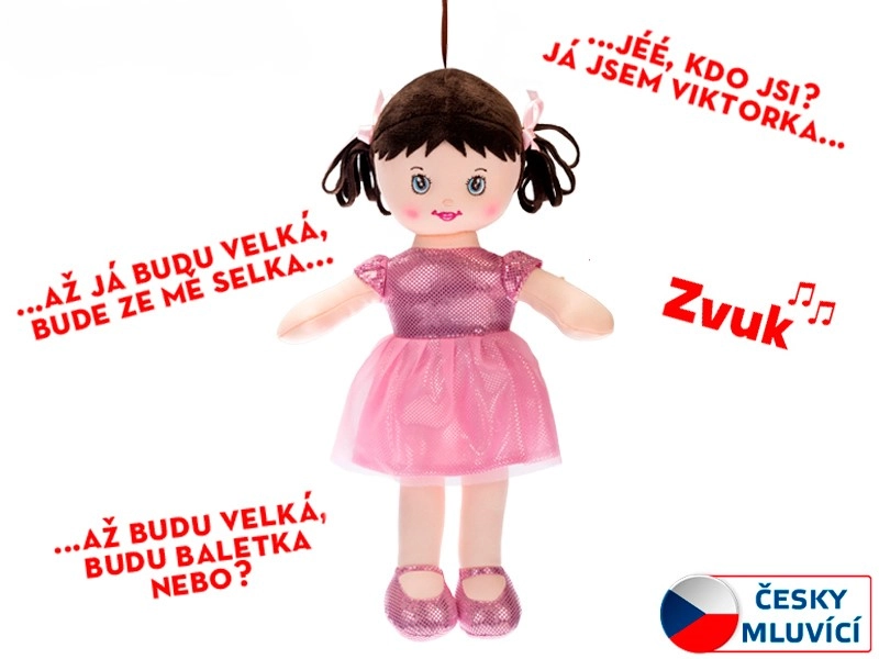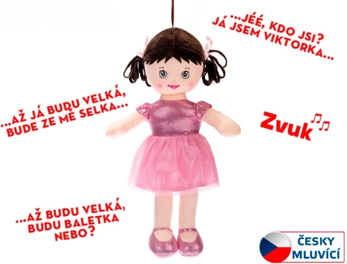 Die niedliche, weiche Puppe Viktorka in hellrosa Kleidchen erfreut jedes kleine Mädchen. Sie kann sprechen und singen das beliebte Lied „Wenn ich groß bin, werde ich Bäuerin…“. Dank der weichen Stoffausführung ist sie ideal zum Kuscheln und geeignet ab der Geburt.