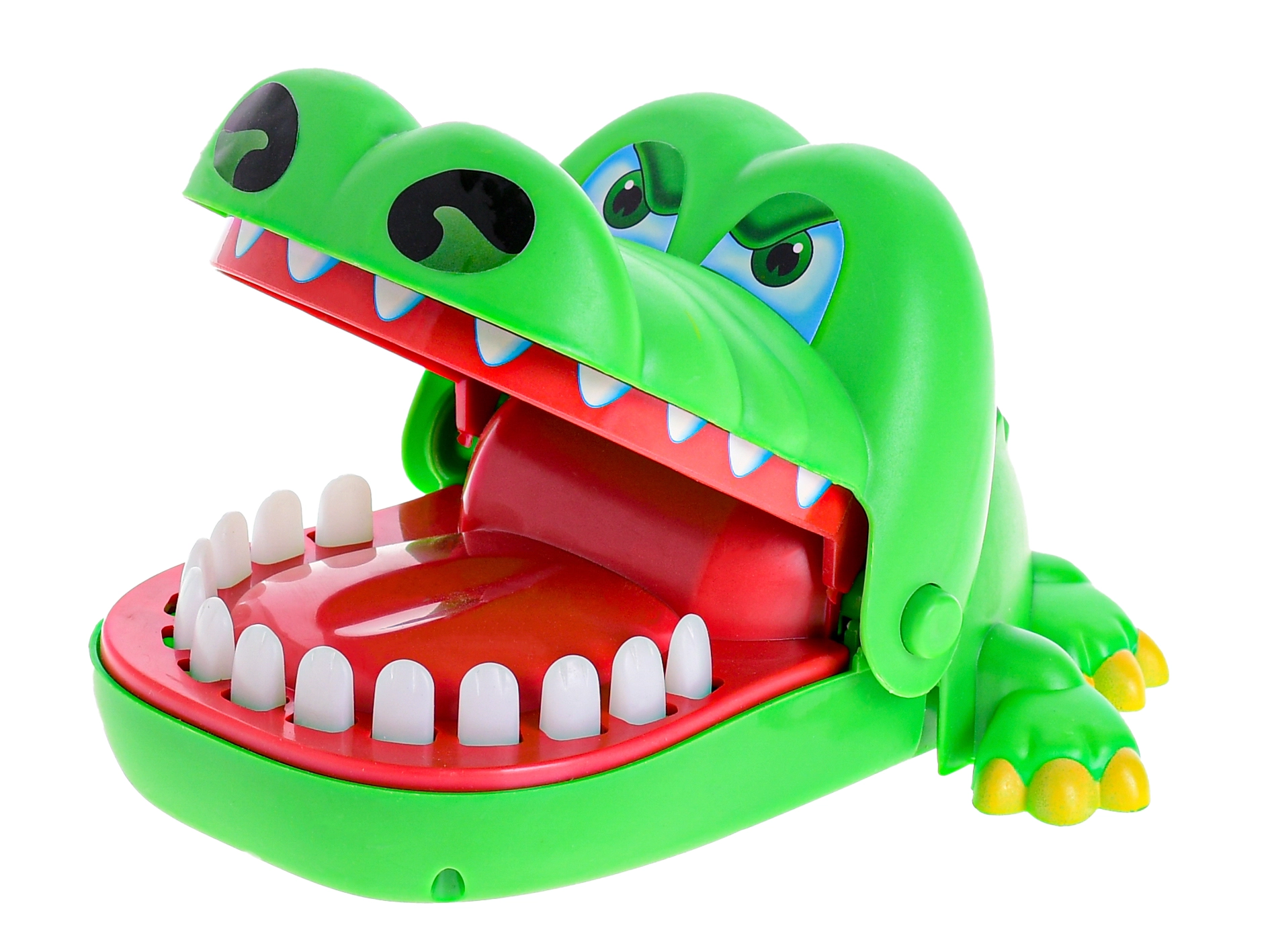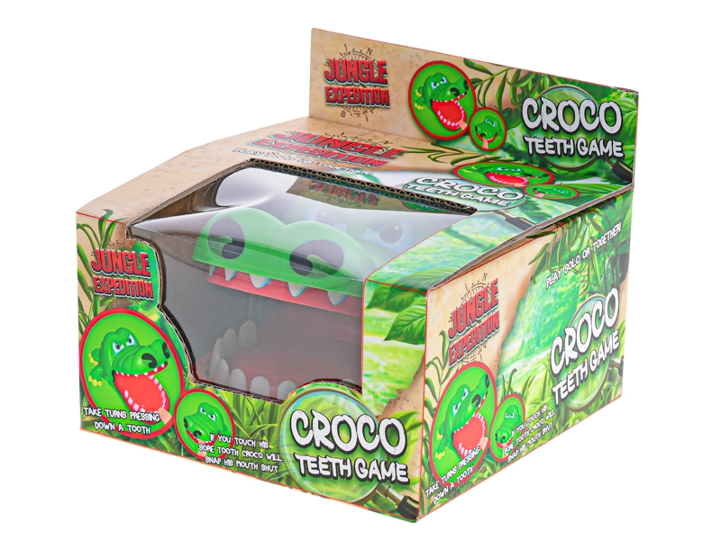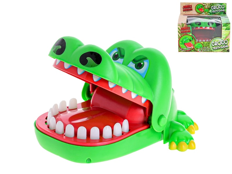 Das fröhliche grüne Krokodil mit aufklappbarem Maul bringt spannende Action in jedes Spiel. Die Spieler wählen abwechselnd Zähne und drücken sie sanft – einer davon löst ein sofortiges Zuschnappen des Mauls aus, das alle überrascht und zum Lachen bringt.