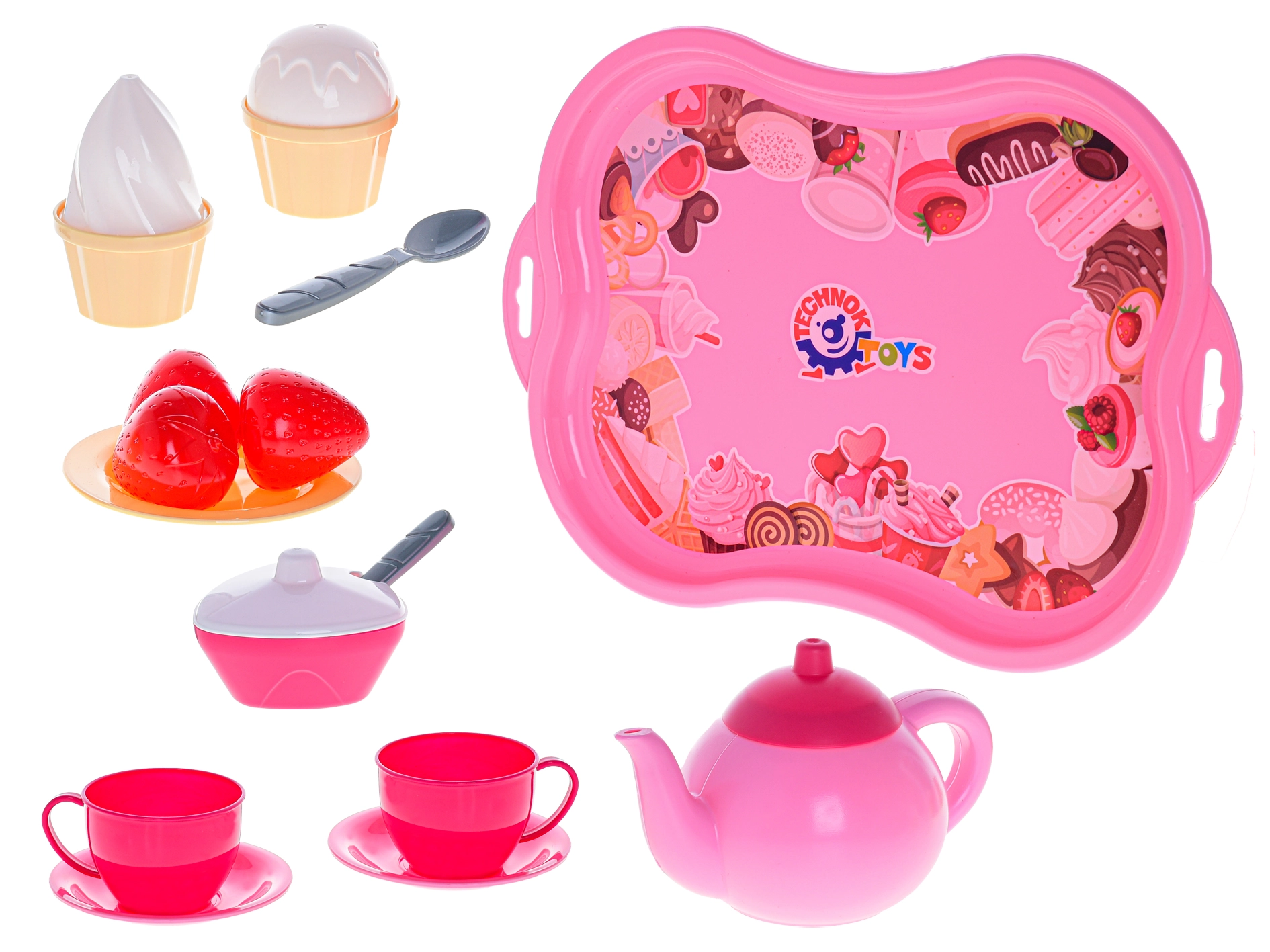 Enthalten sind ein dekoratives Tablett, eine Teekanne mit Deckel, Tassen mit Untertassen, Löffel, kleines Obst und süße Desserts im Eiscreme-Stil. Das Set wird in einem praktischen Netz aufbewahrt, wodurch es sich leicht transportieren und verstauen lässt.