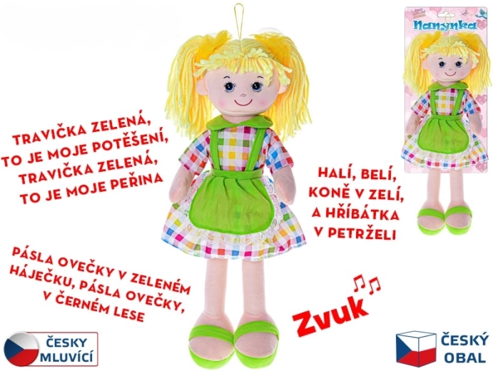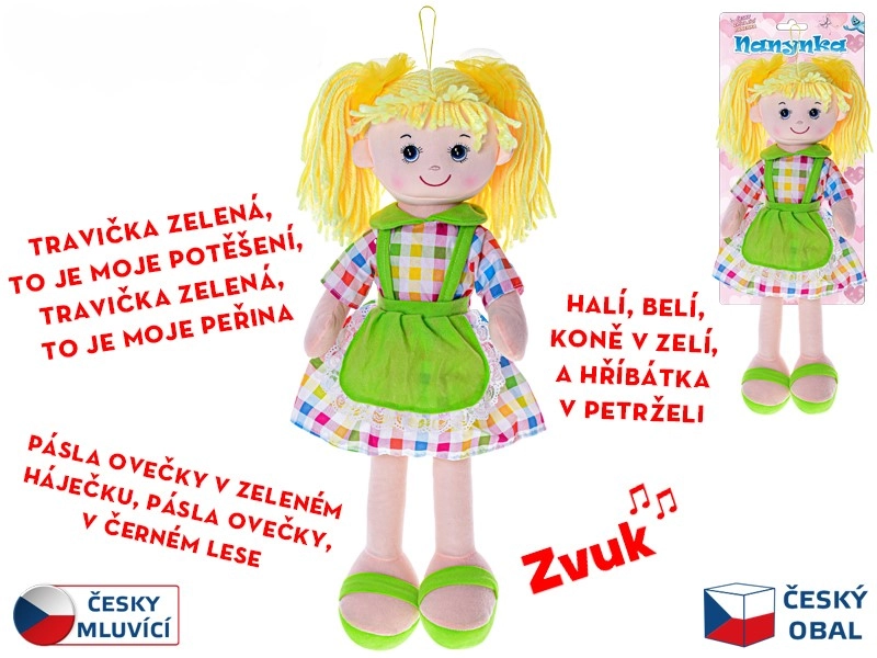 Suchen Sie das erste sichere Spielzeug für die Kleinsten? Puppe Nanynka hat einen weichen Textilkörper, ist angenehm zu berühren und bietet beruhigende sowie unterhaltsame Funktionen. Sie singt beliebte tschechische Lieder wie „Halí, belí…“, „Travička zelená…“ und „Pásla ovečky v zeleném háječku…“, wobei sie auf Tschechisch spricht und singt.