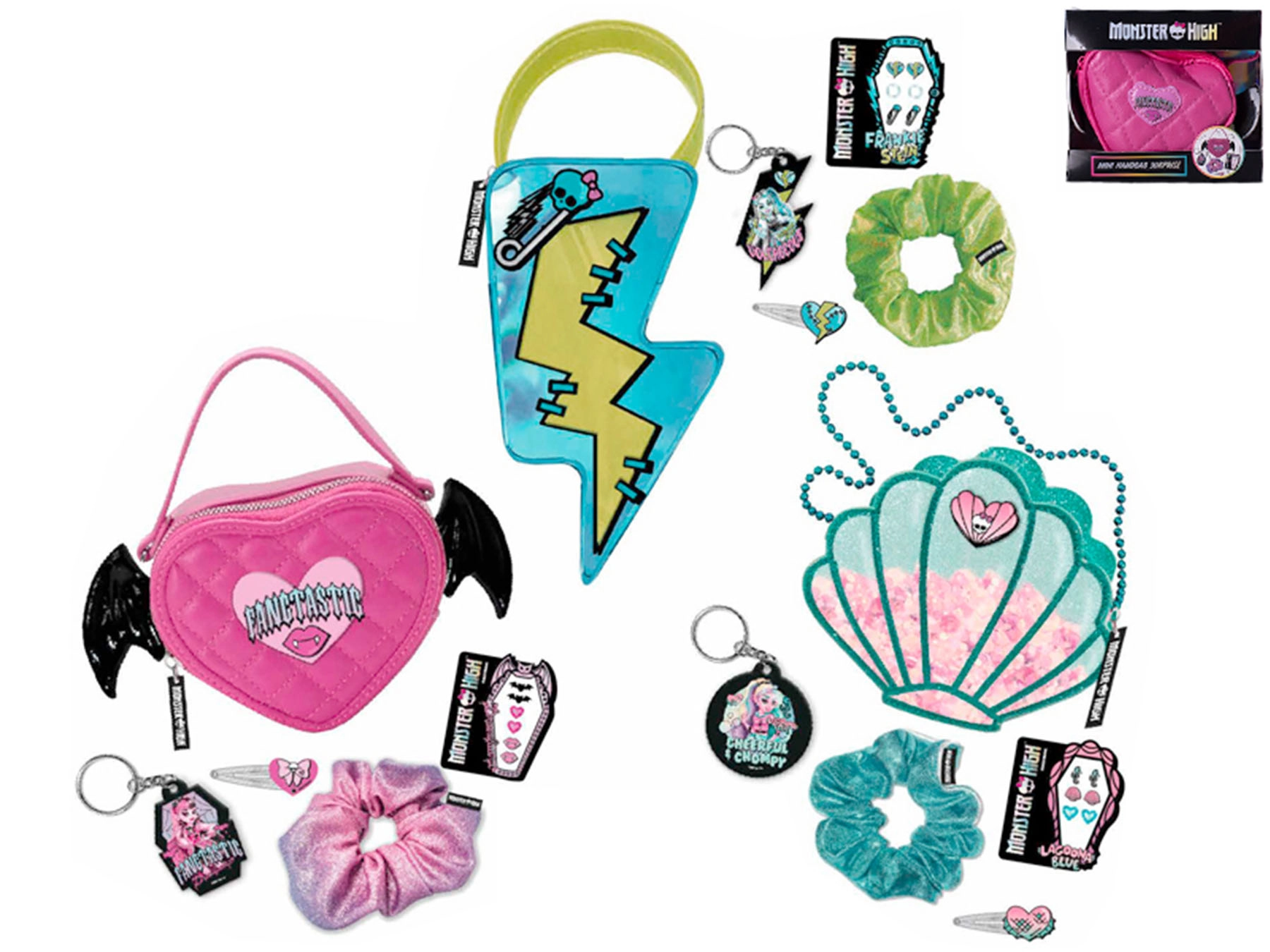 Entdecken Sie den Zauber der MONSTER HIGH Serie mit der niedlichen Mini-Handtasche, die jede kleine Fashionista begeistern wird. Drei originelle Motive – Muschel, Blitz und Herz – verweisen auf beliebte Charaktere und ihren einzigartigen Stil. Jede Ausführung wird durch stylische Kleinigkeiten ergänzt, die zur Persönlichkeit der jeweiligen Figur passen.