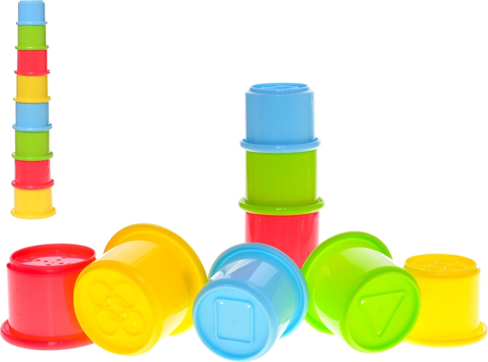 Entdecken Sie ein unterhaltsames Set aus acht bunten Bechern, die sich leicht zu einem stabilen Turm stapeln lassen. Das Spielzeug ist ideal für Kinder ab 6 Monaten und fördert die Feinmotorik, die Koordinationsfähigkeiten und das logische Denken. Dank verschiedener Größen und Farben lernen Kinder, Farben und Formen zu erkennen, während die reliefartige Oberfläche der Becher die taktile Wahrnehmung stimuliert. Leichter und langlebiger Kunststoff sorgt für einfache Handhabung, und das praktische Netz erleichtert Transport und Aufbewahrung.