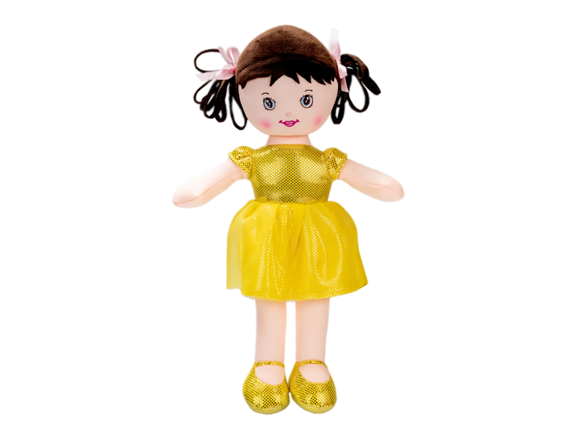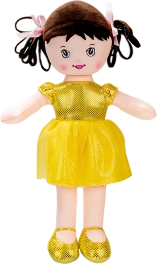 Die Puppe Viktorka ist ein weiches Stoffspielzeug, das für sicheres und angenehmes Spielen sowie Kuscheln entworfen wurde. Dank der leichten Konstruktion und des angenehmen Materials liegt sie hervorragend in kleinen Kinderhänden. Das glänzende gelbe Kleidchen und die Schühchen fallen sofort ins Auge und regen die kindliche Fantasie an.