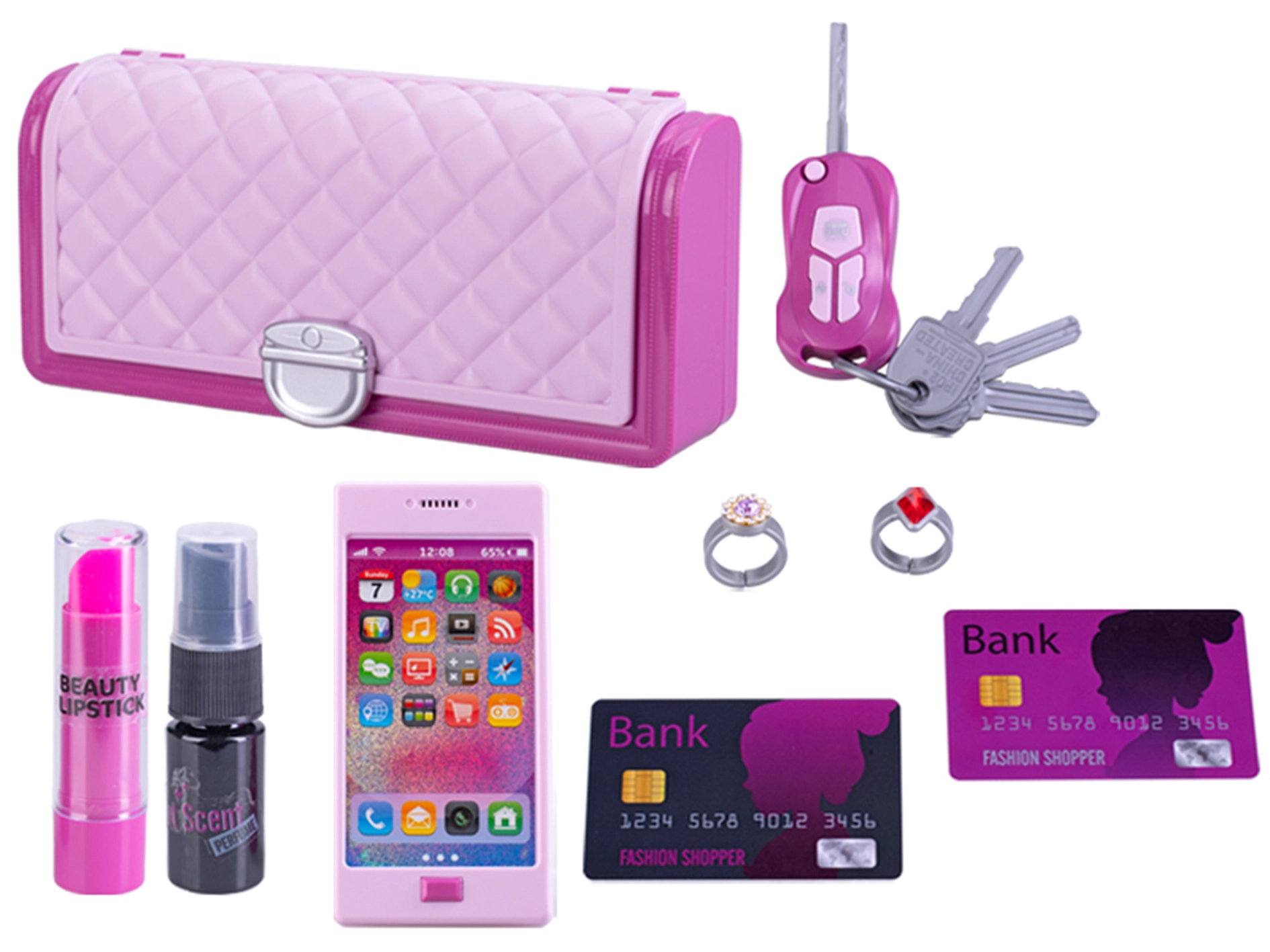 Im Lieferumfang ist alles enthalten, was kleine Fashionistas brauchen: Autoschlüssel, Kamm, Haarspangen und weitere Kleinigkeiten. 3× LR41 Batterien sind bereits beigelegt – einfach auspacken und losspielen.