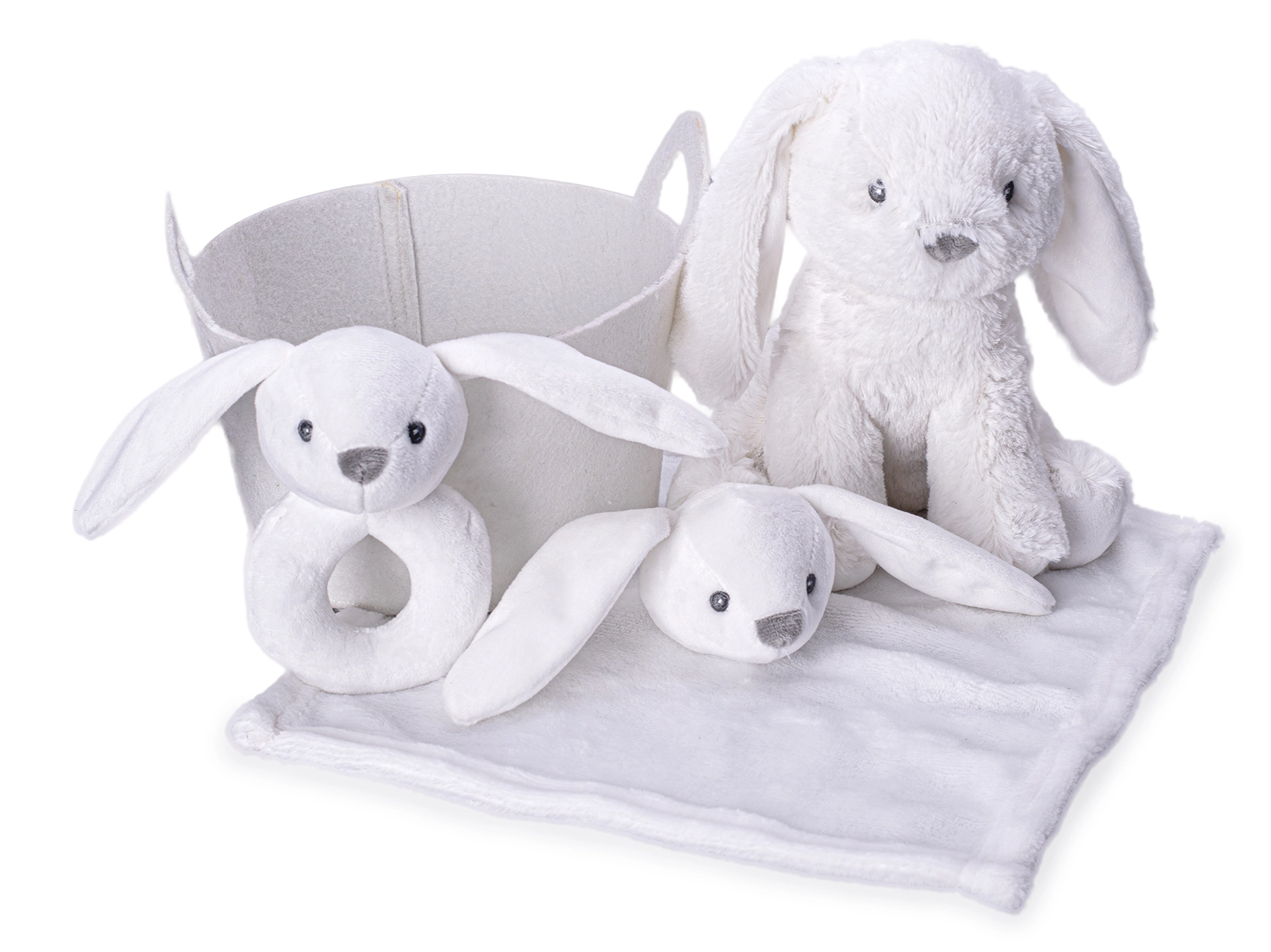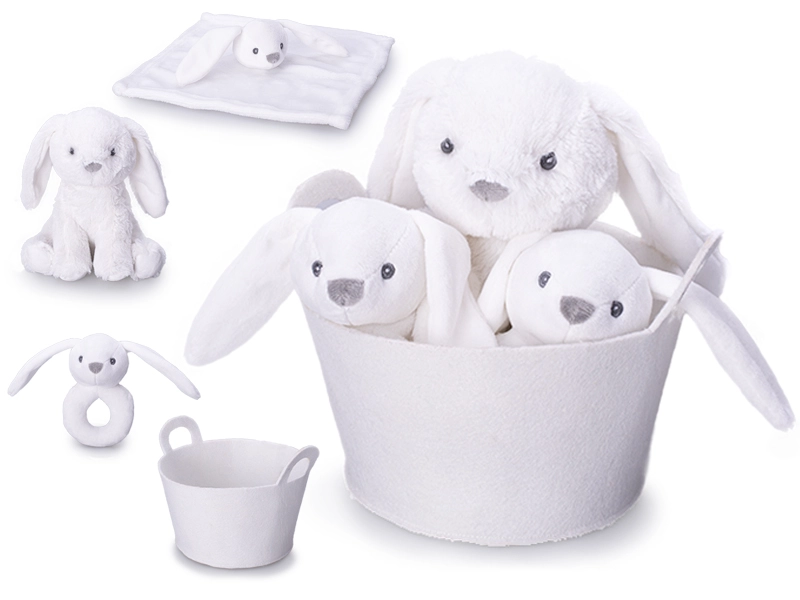 Dieses zarte Set ist ein wunderbares Geschenk für Neugeborene und Kleinkinder. Der niedliche Plüschhase bietet beruhigende Weichheit und Sicherheit beim Kuscheln, die Rassel fördert die Sinneswahrnehmung und Feinmotorik, und das Schmusetuch vermittelt Geborgenheit beim Einschlafen. Alles ist ordentlich in einem weichen Stoffkörbchen verstaut, das in jede Babyausstattung passt.