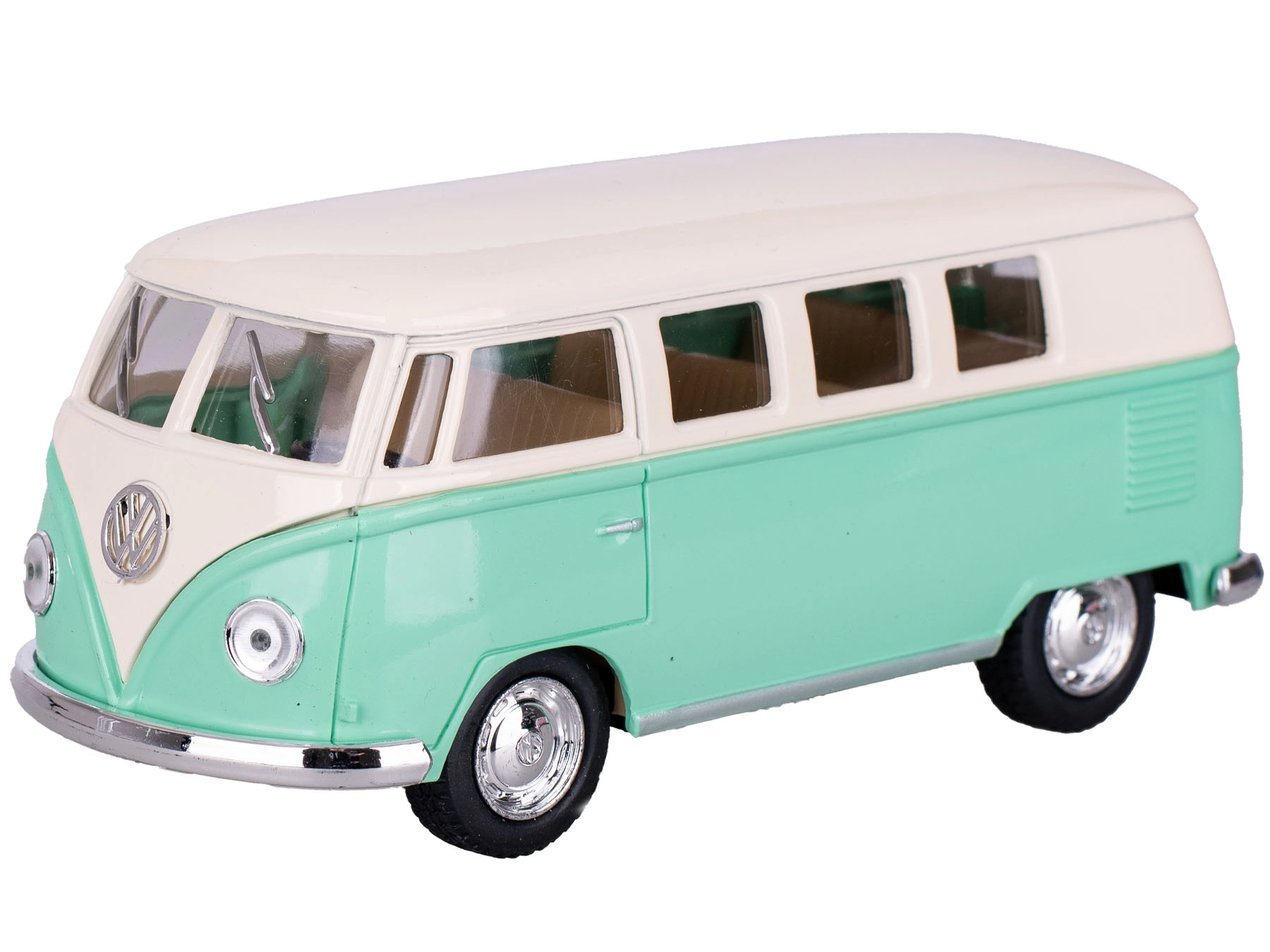 Erleben Sie den ikonischen Stil der 60er Jahre mit dem Modell Volkswagen Classic Bus 1962 von Kinsmart. Dieser präzise ausgeführte Microbus im Maßstab 1:32 bietet authentische Proportionen, realistische Karosseriedetails und eine hochwertige Verarbeitung aus Metall und Kunststoff. Dank der Länge von 13 cm passt er perfekt in die Vitrine und liegt gut in Kinderhänden.