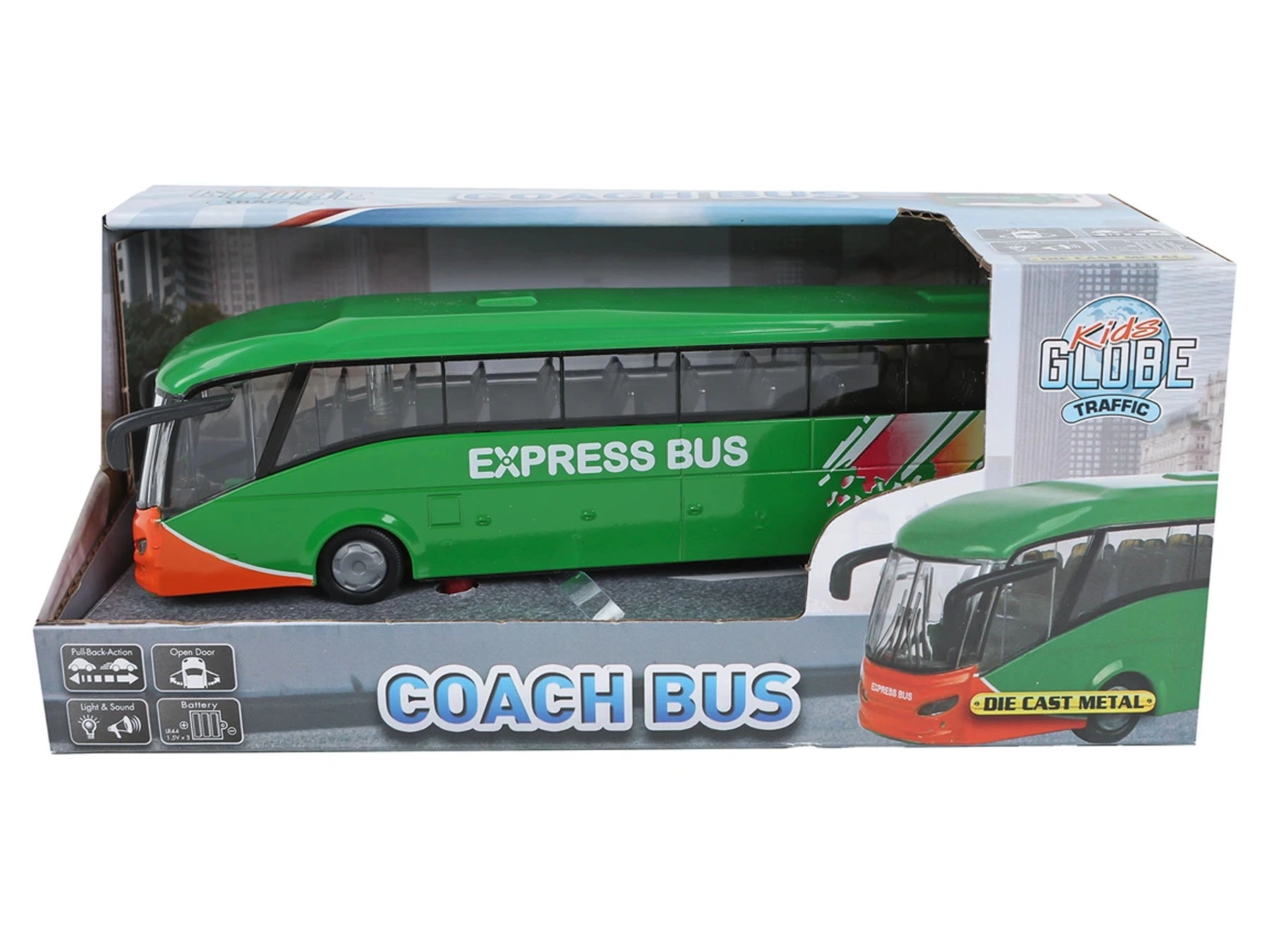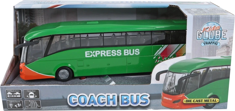 Entdecken Sie den Spaß am Stadtverkehr mit dem Kids Globe Traffic Modell – ein robustes und sorgfältig verarbeitetes Busmodell aus Metall und Kunststoff mit realistischen Details. Dank des Rückziehmotors fährt der Bus nach dem Aufziehen automatisch vorwärts, und die Licht- und Soundeffekte verleihen dem Spiel eine authentische Atmosphäre. Die 3× LR44-Batterien sind im Lieferumfang enthalten, sodass es direkt nach dem Auspacken losgehen kann.