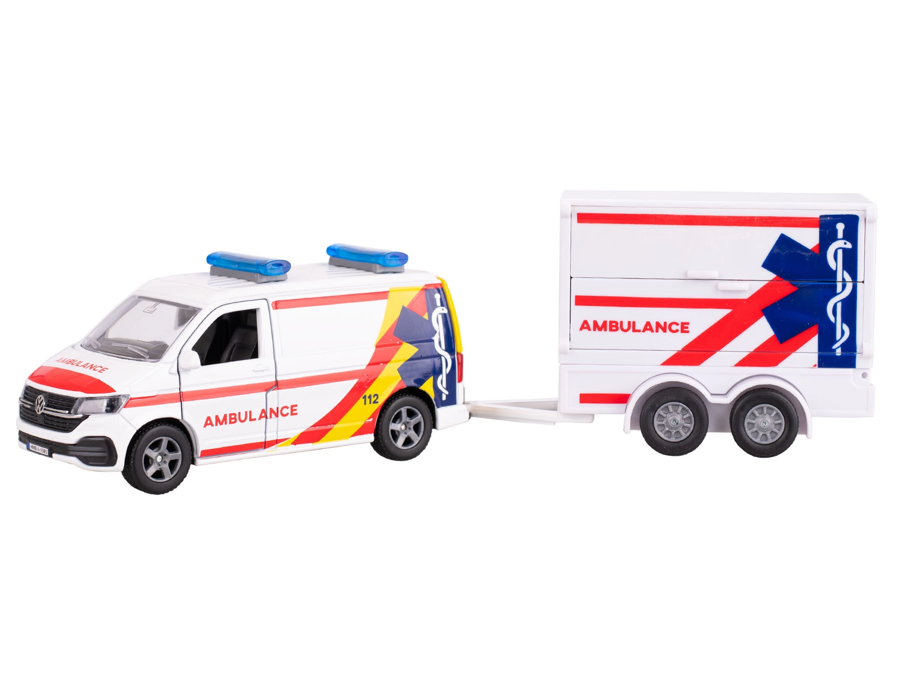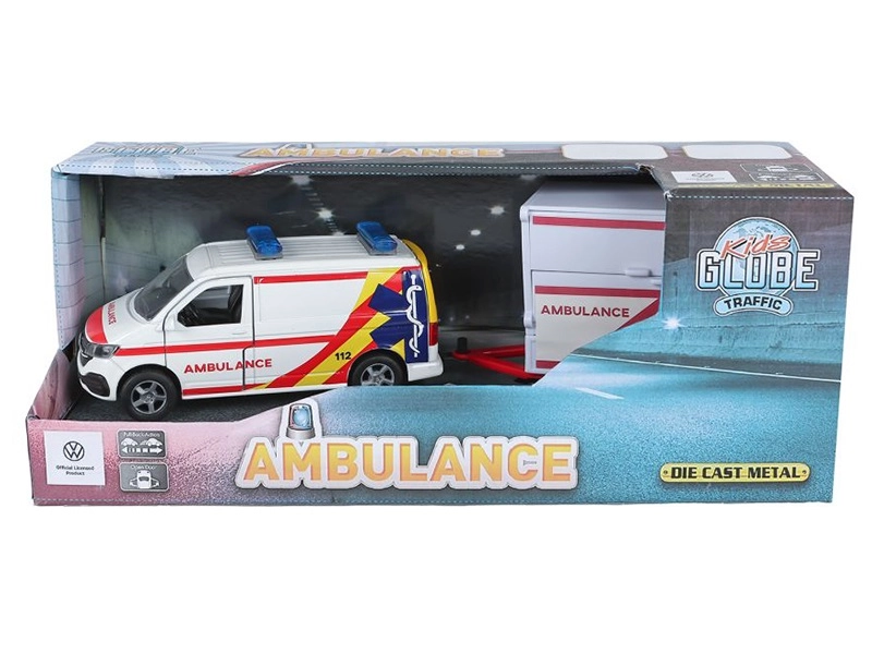 Entdecken Sie das detailliert gestaltete Kids Globe Traffic Modell des VW Transporter Rettungswagens mit Anhänger, das realistische Optik und tolle Funktionen für kreatives Spielen bietet. Durch die Kombination aus Metall und Kunststoff ist das Fahrzeug robust, zugleich leicht und einfach zu handhaben. Der Rückzugmotor und die zu öffnenden Türen sorgen für authentischen Spielspaß – drinnen wie draußen.
