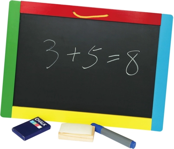 Im Lieferumfang ist alles enthalten: Tafel mit Aufhängeschnur, Set mit Kreiden und Markern sowie ein Wischschwamm. Die robuste Holzkonstruktion gewährleistet Stabilität und eine sichere Nutzung.