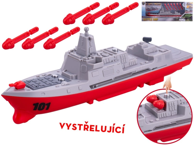 Das Schiff ist mit sechs roten Projektilen ausgestattet, die sich leicht laden und abschießen lassen. Die interaktive Schussfunktion unterstützt die Feinmotorik und die Hand-Auge-Koordination. Das robuste Kunststoffdesign und die attraktive Farbkombination aus Grau mit rotem Unterbau verleihen dem Spielzeug ein glaubwürdiges Aussehen.