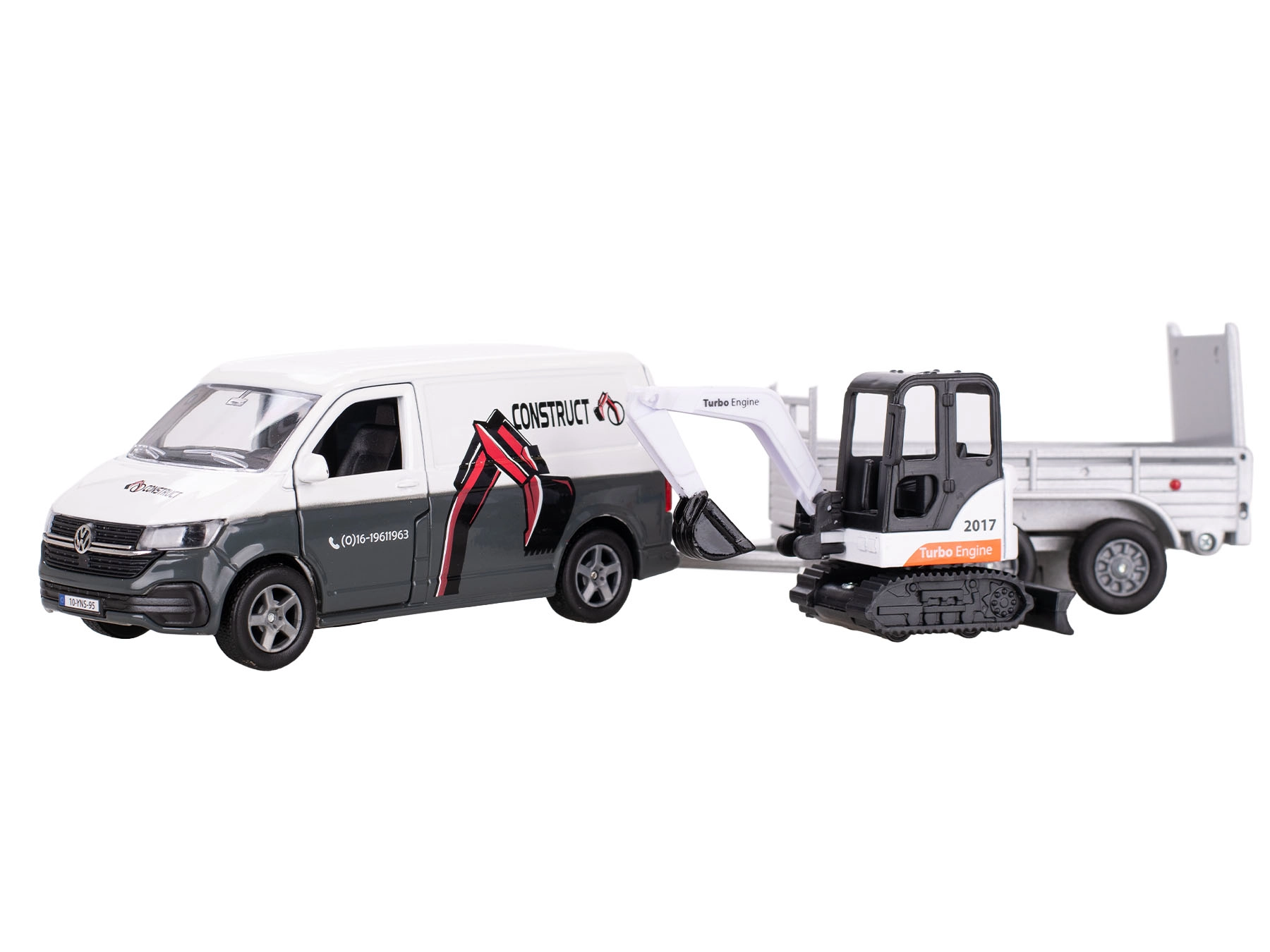 Mit dem Set Kids Globe Traffic gestalten Kinder im Handumdrehen ihre eigene Baustelle. Der realistische VW Transporter mit Rückzugmotor transportiert den Minibagger sicher auf dem abnehmbaren Anhänger, damit die „Aushub“-Arbeiten sofort beginnen können. Die robuste Verarbeitung aus Metall und Kunststoff sorgt auch bei intensivem Spiel für eine lange Lebensdauer.
