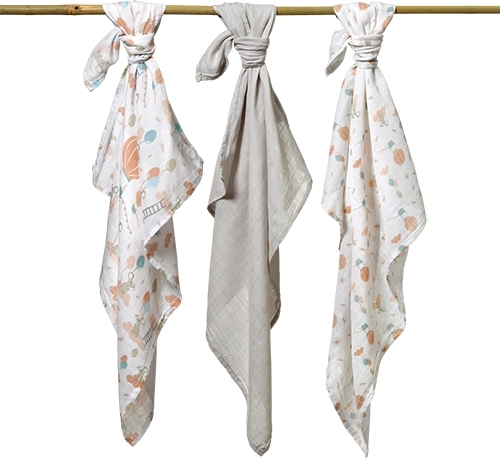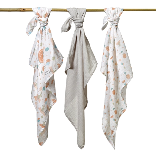 Zwei Tücher mit dezentem Print und ein einfarbiges. Das neutrale Design lässt sich leicht mit weiterer Babyausstattung kombinieren.