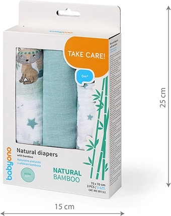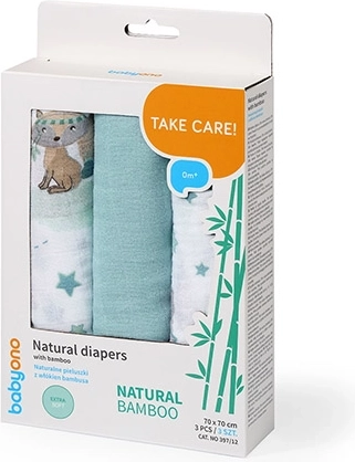 Die Babyono Bambuswindeln aus 70 % Bambus und 30 % Baumwolle bieten einen seidig weichen Griff und hervorragende Saugfähigkeit. Die leichte und luftige Musselinstruktur sorgt das ganze Jahr über für Komfort – kühl im Sommer, angenehm wärmend im Winter. Das universelle quadratische Format 70 × 70 cm passt in Kinderwagen, Bettchen und ist ideal für unterwegs.