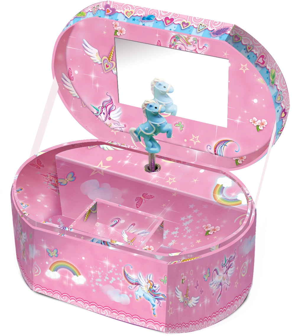 Das ovale Schmuckkästchen mit einem niedlichen Einhorn ist für Kinder ab 3 Jahren konzipiert. Beim Öffnen erklingt eine angenehme Melodie, die jedem Aufbewahren von Schmuck eine zauberhafte Atmosphäre verleiht. Dank hochwertiger Materialien ist es robust und langlebig und dennoch leicht für eine einfache Handhabung.