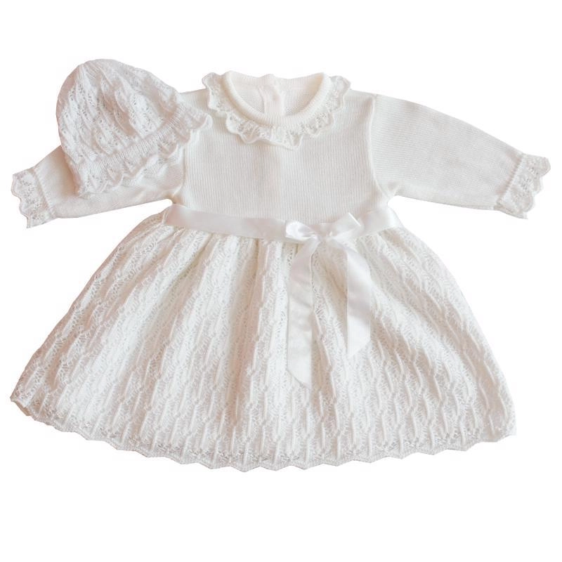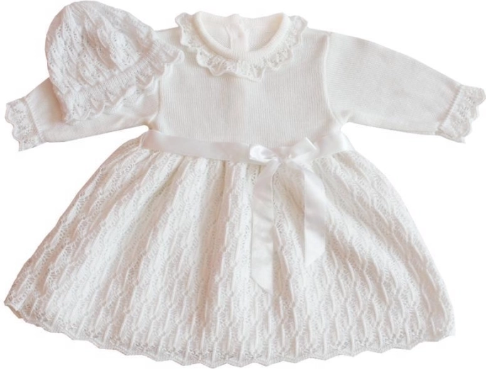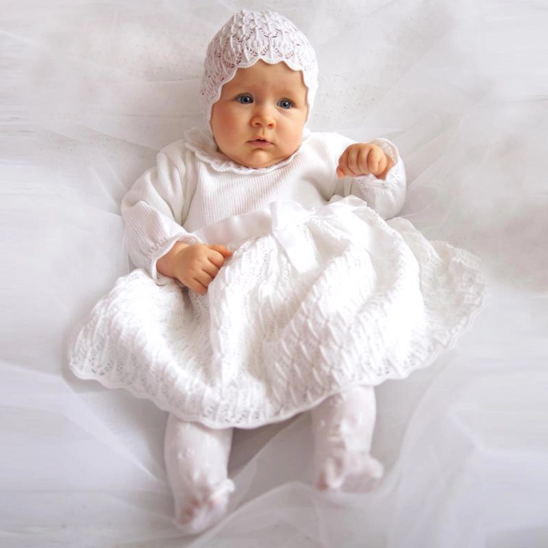 Dieses festliche Tauf-Set für Mädchen vereint zeitlose Eleganz und Komfort. Das Strickkleid mit zartem Ajourmuster wird durch ein passendes Mützchen ergänzt, das das Köpfchen des Babys schützt. Dank der hochwertigen Fasermischung ist das Set angenehm im Griff, luftig und für ganztägiges Tragen am besonderen Tag geeignet.