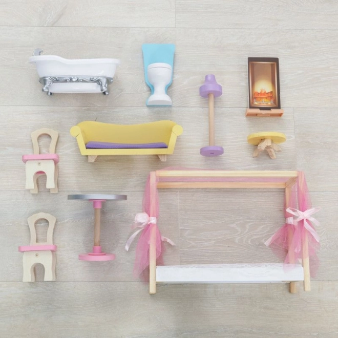 Umfangreiches Zubehör inklusive – Himmelbett, Badewanne, Sofa und weitere Extras für sofortige Geschichten.