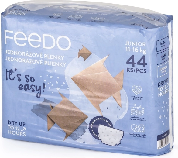 Die FEEDO Windeln Junior 5 wurden entwickelt, um Kindern ganztägige Trockenheit, Bewegungsfreiheit und zuverlässigen Schutz zu bieten. Der superabsorbierende Kern mit Mehrschichtsystem verteilt die Flüssigkeit über die gesamte Fläche und hält sie bis zu 12 Stunden im Inneren. Die atmungsaktive Struktur ermöglicht der Haut zu atmen und reduziert das Risiko von Reizungen.