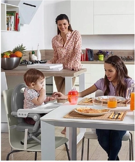 Die kompakte, klappbare Konstruktion mit integriertem Tragegriff erleichtert Transport und Aufbewahrung. Rutschhemmende Elemente und eine stabile Basis tragen zu Sicherheit bei jeder Mahlzeit bei – zu Hause, bei den Großeltern oder im Restaurant.
