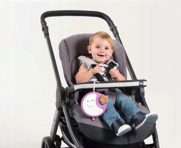 Dank der abnehmbaren elektronischen Einheit mit mondförmigem Licht verwenden Sie das Produkt auch außerhalb des Bettes – einfach an der Bettkante, am Kinderwagen oder am Griff des Autositzes befestigen. Die rotierende Spirale aus weichem, hypoallergenem Gewebe mit vier Hängespielzeugen fördert den Seh- und Aufmerksamkeitsfokus des Kindes und unterstützt ein entspanntes Einschlafen.