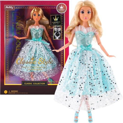 Elegante Modepuppe in langen hellblauen Kleidern, die die kindliche Fantasie und Fähigkeiten fördert. Ideal für Rollenspiel und das Zusammenstellen von Outfits. Wunderschönes Abendkleid, hochwertige Verarbeitung und sichere Materialien begeistern jede kleine Modeliebhaberin.