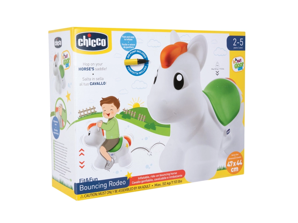 Das aufblasbare Hüpfpferd CHICCO Rodeo ist der ideale Begleiter für die ersten Hüpf- und Abstoßversuche. Dank der sanften Formen, abgerundeten Kanten und des ergonomischen Sitzes sitzt es sich bequem und die Fahrt ist stabil. Das Hüpfspielzeug lässt sich mit der beiliegenden Handpumpe schnell und einfach aufpumpen – so ist es in kürzester Zeit spielbereit.