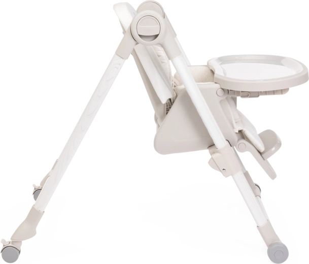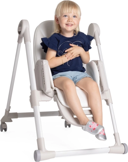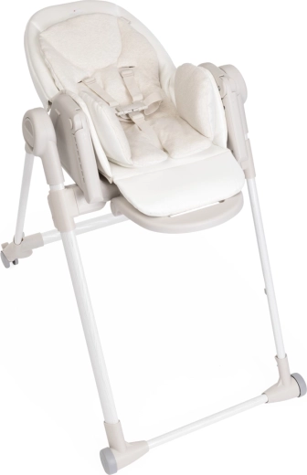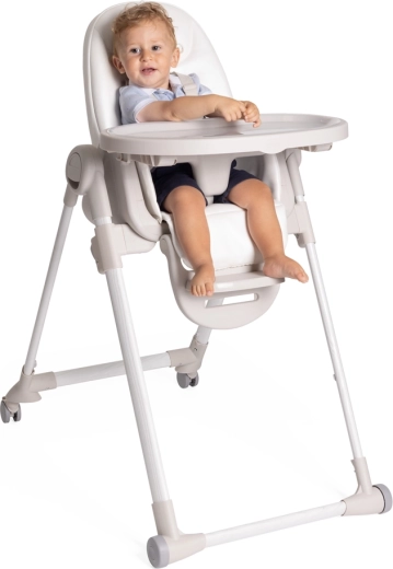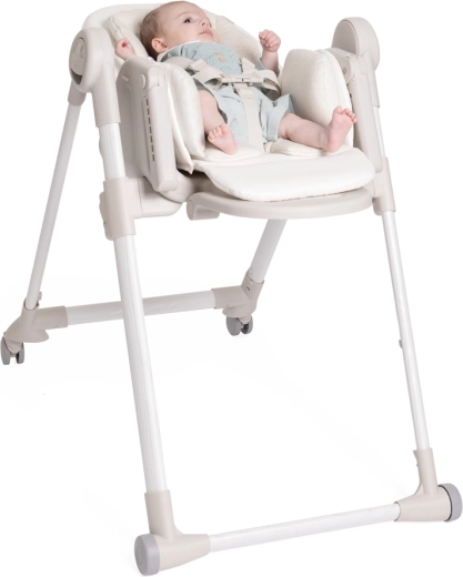 Praktische Funktionen erleichtern den Alltag: 9 Höhenniveaus zur Anpassung an jeden Tisch, Rückenlehnenverstellung bis zur vollständigen Liegeposition für die Erholung des Babys, eine verstellbare Fußstütze und ein abnehmbares Tablett für einfaches Servieren oder das Heranrücken an den Tisch. Vier Räder ermöglichen ein sanftes Umstellen in der Wohnung, kompaktes Zusammenklappen mit Selbststand spart Platz. Der Bezug aus 100% recycelten PET-Fasern ist wasserabweisend, angenehm im Griff und maschinenwaschbar.