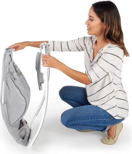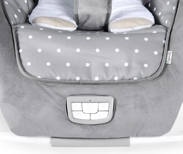 Dank des schlanken Klapprahmens lässt sich die Wippe schnell nahezu flach zusammenlegen – ideal, um zu Hause Platz zu sparen oder für unterwegs. Das abnehmbare Mobile mit zwei Plüschspielzeugen regt die Sinne an und sorgt für Unterhaltung, die Spielzeuge können jederzeit für das freie Spiel abgenommen werden. 5-Punkt-Gurte und die stabile Konstruktion gewährleisten eine ruhige und sichere Nutzung.