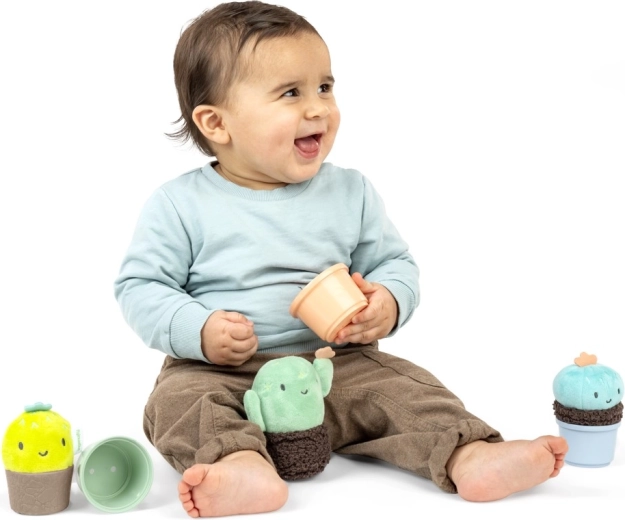 Die Becher lassen sich übereinander und ineinander stapeln, während die weichen Kakteen in die „Töpfe“ gesteckt werden. Das Kind erkundet Größen, Reihenfolgen und räumliche Beziehungen.
