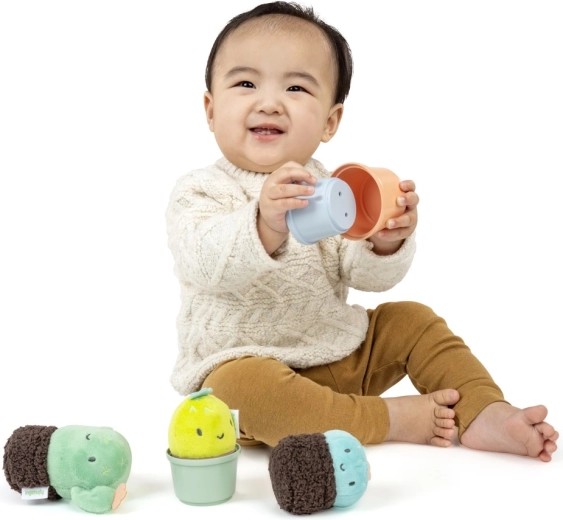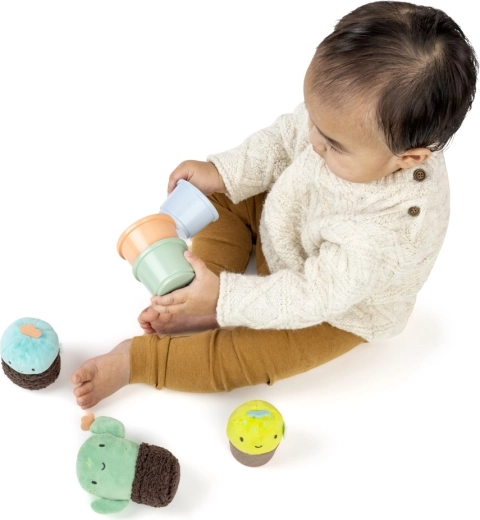Mit jedem Schütteln entsteht ein sanfter Klang, der das Hörvermögen anregt und die Freude am Entdecken weckt. Die weichen Plüsch-„Kakteen“ liegen auch den kleinsten Händchen gut in der Hand, die glatten Becher können ineinander gesteckt oder aufeinander gestapelt werden. So lernt das Kind ganz natürlich Prinzipien von Größe, Reihenfolge und räumlicher Orientierung.