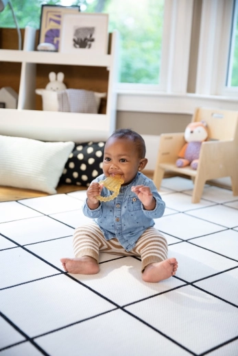 Der ergonomische Ring ist für kleine Kinderhände gestaltet, damit das Baby den Beißring sicher halten und sich selbst beruhigen kann.