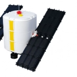 Die Konstruktion des Satelliten beinhaltet Sonnenkollektoren, die die Energienutzung im Orbit veranschaulichen.