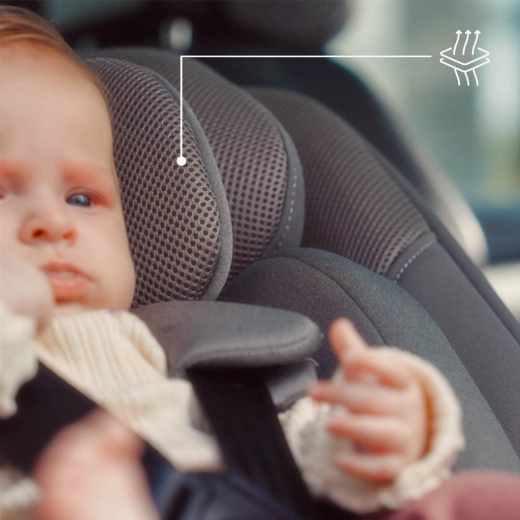 Die Schutzsysteme H-GUARD (verstärkte, dreilagige Kopfstütze mit Memory-Schaum) und SIDE PROTECT absorbieren die Aufprallenergie effektiv. Das Reclining System bietet 4 Neigungspositionen, während eine belüftete Schale und der atmungsaktive Bezug das Schwitzen bei Hitze reduzieren. EASY GROW ermöglicht das Einstellen von Kopfstütze und Gurten mit einer Hand (6 Positionen). Inklusive Neugeboreneneinlage bis 60 cm für die korrekte Positionierung des Babys.