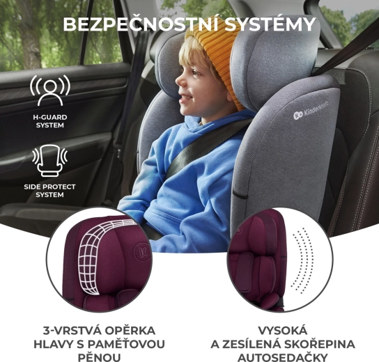 Für zusätzliche Sicherheit sorgen hohe Seitenprotektoren SIDE PROTECT SYSTEM und die 3-lagige Kopfstütze H-GUARD mit Memory-Schaum, die die Aufprallenergie effektiv absorbieren. Für Komfort auf jeder Strecke gibt es RECLINING mit 5 Neigungspositionen, eine breite Sitzfläche, weiche Polsterung und eine herausnehmbare Einlage für kleinere Kinder. Der Bezug ist maschinenwaschbar, an den Seiten befinden sich praktische Haken zum Fixieren der Gurte beim Anschnallen des Kindes.