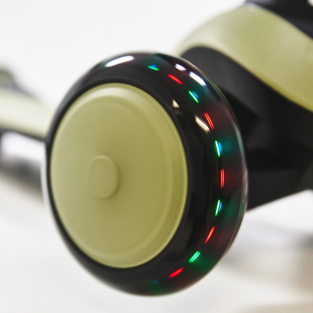 Große vordere PU-Räder mit LEDs leuchten während der Fahrt. Sie erhöhen die Sichtbarkeit in der Dämmerung und verleihen der Fahrt einen coolen Look – ganz ohne Batterien.